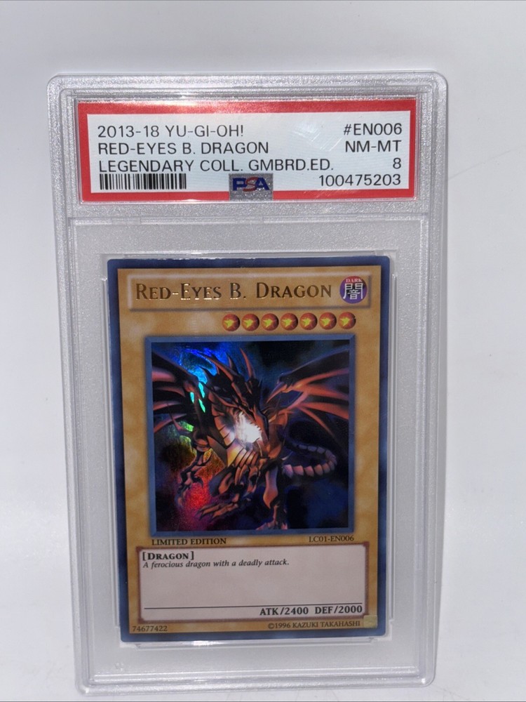This is a rare and highly sought-after card from the Yu-Gi-Oh! Legendary Collection set. The Red-Eyes Black Dragon LC01-EN006 is a limited edition card with a stunning holo finish. It features the iconic character Joey Wheeler and is made from high-quality card stock material. The card is standard size and is perfect for collectors and players of the Yu-Gi-Oh! TCG game. It is in English language and manufactured by Konami. The card belongs to the Dark attribute and Dragon creature/monster type. The card number is LC01-EN006 and it is a normal card type. The card is not autographed and is suitable for age level 6+.