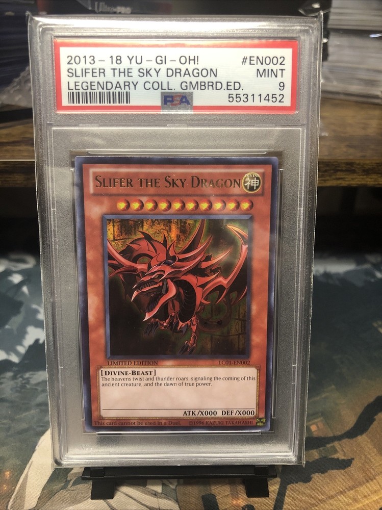 Looking for a powerful card to add to your Yu-Gi-Oh! collection? Look no further than this PSA 9 Slifer the Sky Dragon from the Legendary Collection. This limited edition card features a divine-beast creature with X000 defense and X000 attack power, making it a formidable addition to any deck. With a holo finish and rare attributes such as Divine color and speciality, this card is sure to impress. Whether you're a collector or a player, don't miss your chance to own this highly sought-after card from Konami. Add it to your collection today!