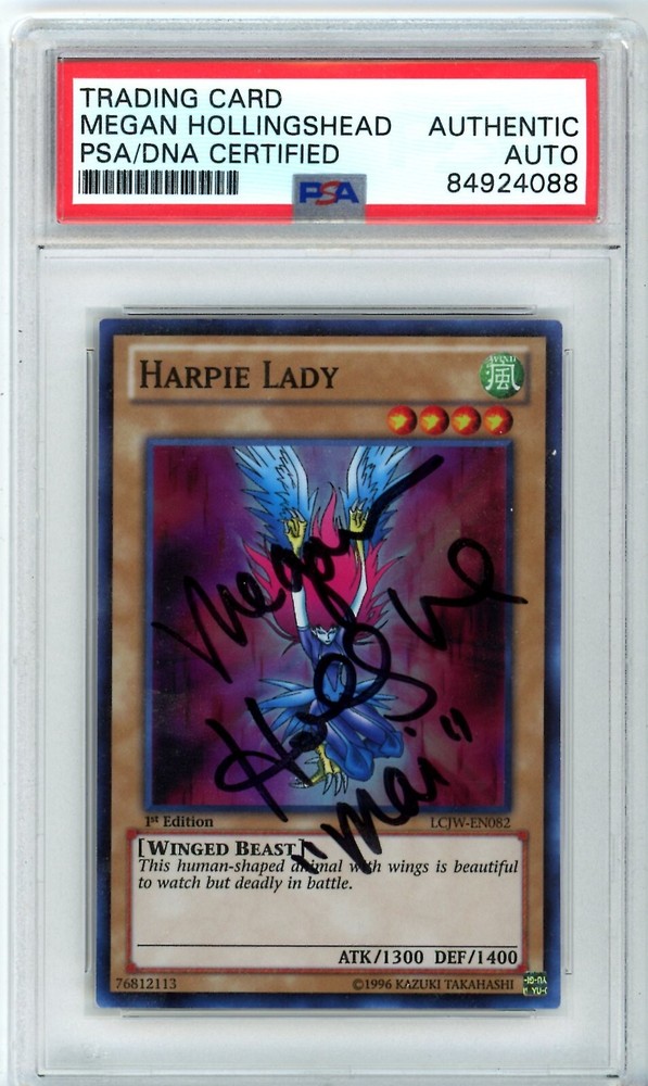 The product is a PSA Megan Hollingshead Harpie Lady card from the Yu-Gi-Oh Legendary Collection 4: Joey's World-1st Edition. This super rare collectible card features a Wind attribute, 1300 attack power, 1400 defense, and is signed by Megan Hollingshead with a hard-signed autograph. Authenticated by Professional Sports Authenticator (PSA) and manufactured by Konami, this vintage card is a valuable addition to any Yu-Gi-Oh! TCG collection. Its unique features, such as being a 1st Edition with a holo finish, make it a sought-after piece for collectors.