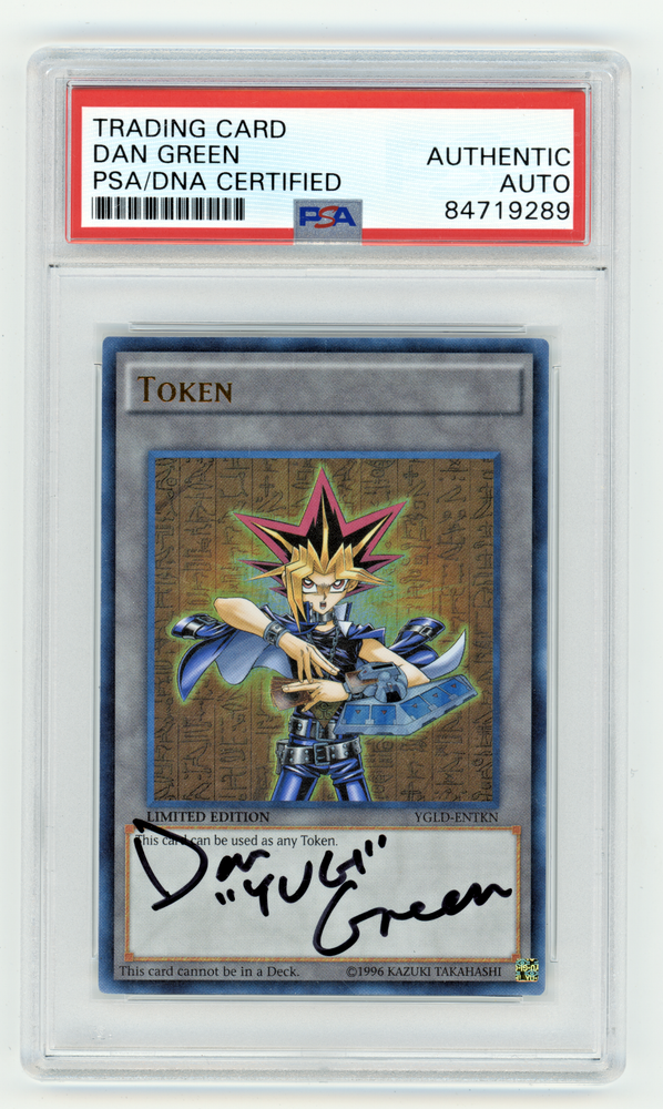 This Konami-manufactured Token Card from the Yugioh Game is autographed by Dan Green, the voice of Yugi Muto, making it a unique collectible. It is part of Yugi's Legendary Decks set, with Standard size and Limited Edition features. The card's name is simply Token, and it is in English language. This collectible card game item has a Rarity of Token and is a great addition to any Yugioh fan's collection. It is a United States product, and its authenticity has been verified by PSA. Get your hands on this signed Token Card and own a piece of Yugioh history!