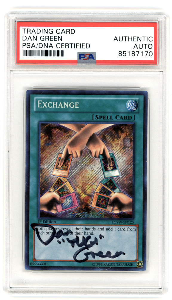 This item is a unique collectible from the Yu-Gi-Oh! TCG game. It features a Secret Rare, 1st Edition, Holo finish card called Exchange with the autograph of Dan Green, a well-known voice actor in the industry. This card is part of the Legendary Collection 3: Yugi's World set, manufactured by Konami. Purchase this card now to add to your collection and own a piece of Yu-Gi-Oh! history.