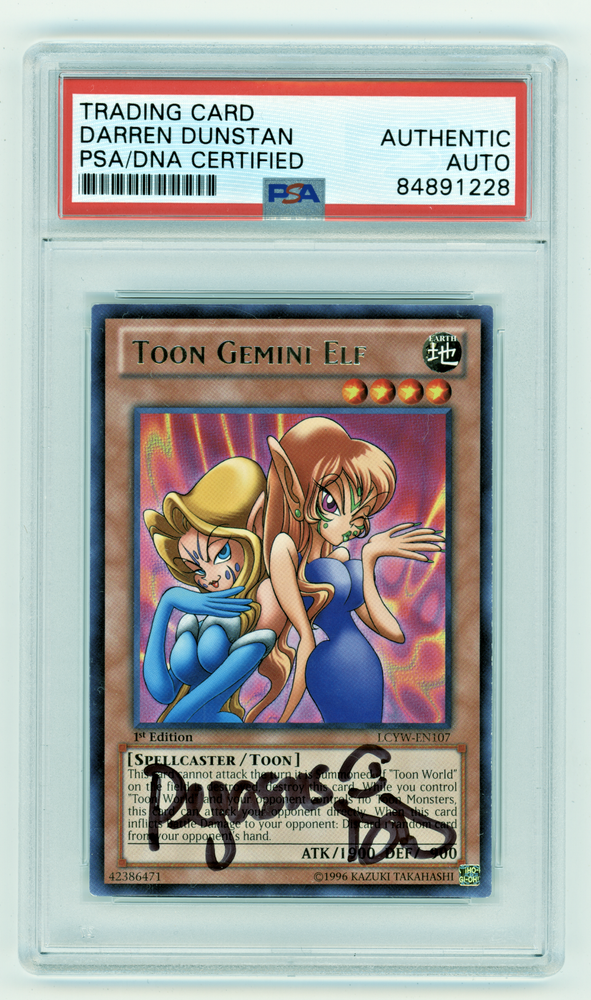 This PSA authenticated Toon Gemini Elf card is a rare find for any Yu-Gi-Oh! TCG collector. The card features Toon Gemini Elf which is part of Maximillion Pegasus deck and is from the Legendary Collection 3: Yugi's World set. With its 1st edition status, this card is a must-have for any serious collector. In addition to its rarity, this Toon Gemini Elf card is autographed by Darren Dunstan, adding an extra layer of value to this already highly sought-after item. The card is a Toon type, with the creature/monster type being a spellcaster. Its card number is LCYW-EN107. Don't miss out on the opportunity to add this unique and special card to your collection.