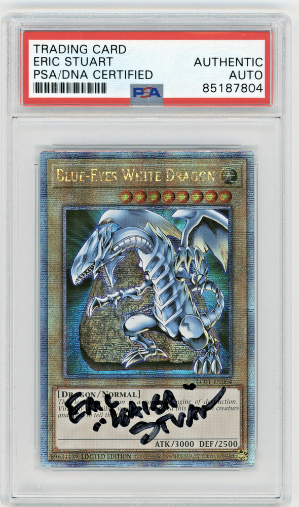 This Yu-Gi-Oh! TCG card is an Ultra Rare Blue-Eyes White Dragon from the Legendary Collection set. It features an autograph from Eric Stuart and is a Limited Edition card. The card is in English and has a foil finish. This card is a must-have for any Yu-Gi-Oh! collector or fan of the character family.