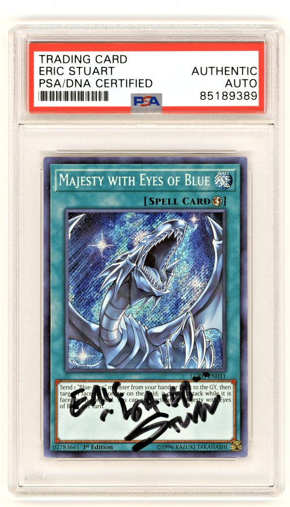 For sale is a highly collectible Yu-Gi-Oh! card, Majesty with Eyes of Blue from Legendary Collection Kaiba. This card features a beautiful dragon creature type, and is a Secret Rare with a Holo finish. It has been professionally authenticated by Professional Sports Authenticator and comes with an autograph from Eric Stuart. This is a 1st Edition card and is perfect for any Yu-Gi-Oh! collector or fan.