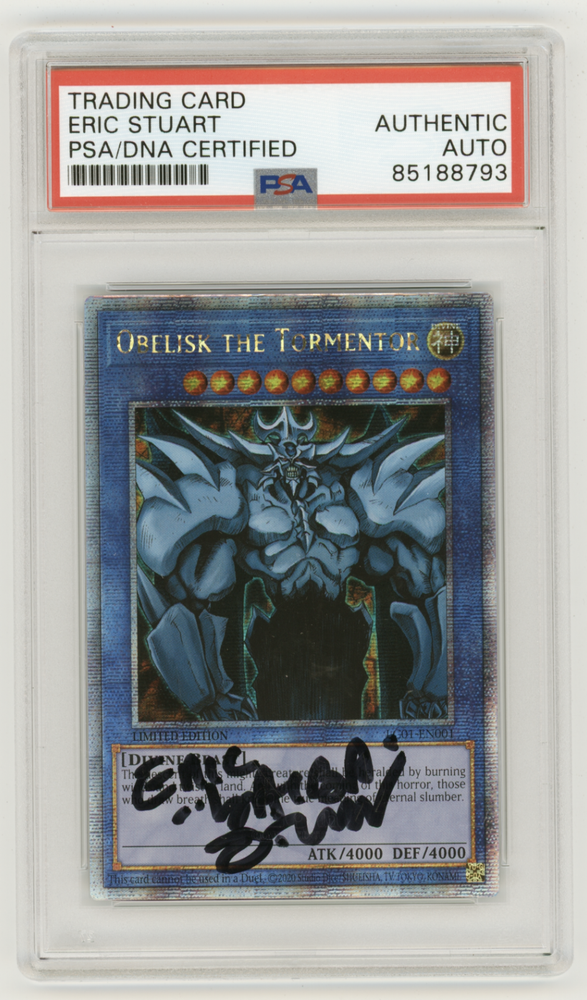 This Yu-Gi-Oh! TCG card is a limited edition quarter century rare Obelisk The Tormentor, signed by Eric Stuart and numbered LC01-EN001. It features a holographic finish and is part of the Legendary Collection: 25th Anniversary set. The card is in English language and manufactured by Konami. The card size is Japanese and it is a normal card type. It belongs to the Attribute/MTG:Color category and is perfect for collectors of CCG individual cards and collectible card games. Get your hands on this unique piece of Yu-Gi-Oh! memorabilia today!