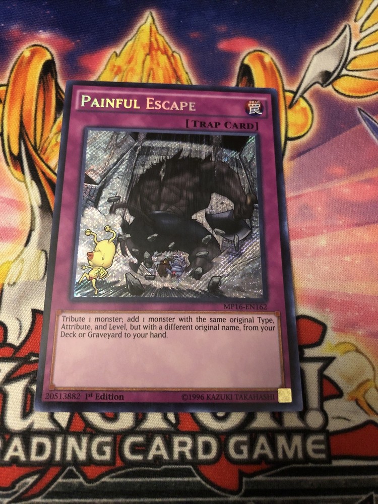 The product is a 2016 1st Edition Yu-Gi-Oh! TCG card from the Mega-Tins Mega Pack set. It is a Secret Rare Trap-Normal card named "Painful Escape" with the card number MP16-EN162. Manufactured by Konami in 2016, this English-language card is designed for collectors and players of the Yu-Gi-Oh! trading card game. With its unique attributes and rarity, this card is a valuable addition to any card collection.