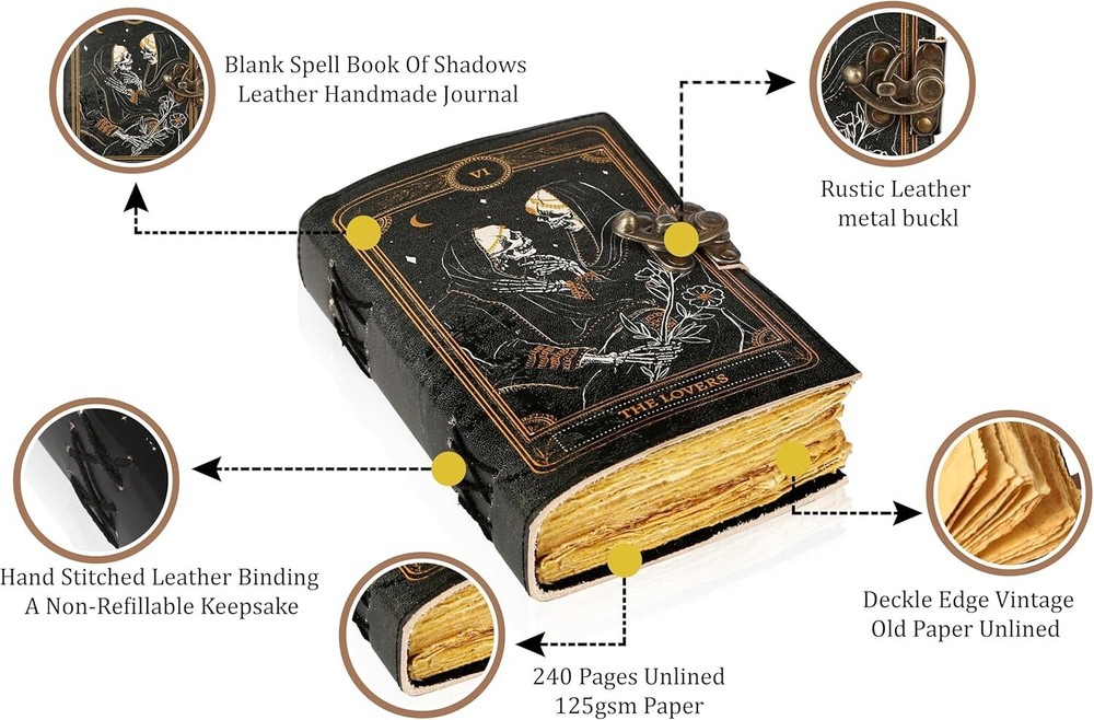 This handmade leather grimoire is absolutely stunningāthe craftsmanship is top-notch, with rich detailing and a luxurious feel. The deckle-edge pages add a mystical touch, perfect for spells, tarot notes, or personal reflections. Itās sturdy, beautifully designed, and feels like a true sacred space for your thoughts. A must-have for any witch or spiritual seeker!