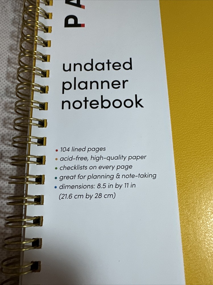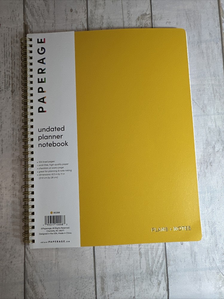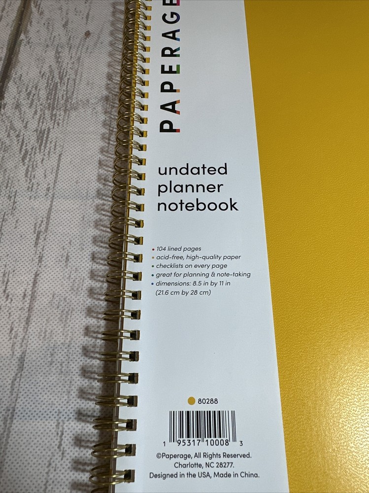 Keep yourself organized with this stylish undated planner from Paperage. The spiral-bound soft cover notebook features a durable yellow plastic cover and acid-free high-quality paper that will keep your notes safe for years to come. Measuring 8.5 x 11 inches, it is the perfect size for all your planning needs. With 104 lined pages, you'll have plenty of space to jot down notes, ideas, and important dates. This organizer is perfect for use as an office product. It is ideal for those who need to plan their schedule in advance. The planner is made in the United States and is part of the BLANK_BOOK product line. Whether you need a planner for business or personal use, this undated organizer will help you stay on track.