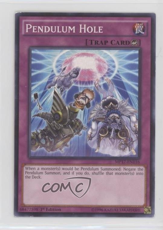 2017 Yu-Gi-Oh! Mega-Tins - Mega Pack [Base] - 1st Edition #MP17-EN116 Pendulum Hole COMC Item: 106585455 - YuGiOh Card Search for more: 2017 Yu-Gi-Oh! Mega-Tins Search for more: 2017 Yu-Gi-Oh! Mega-Tins - Mega Pack [Base] - 1st Edition View all of our Listings Auctions Buy It Now About Us Located in the beautiful Pacific Northwest, COMC (Check Out My Cards) is the world's largest consignment service for trading card singles. More than 10,000 people have used our consignment service to list over 50 million trading cards. Find out how we can help you consign your items on eBay by contacting us through eBay messaging. COMC -- "The Safe & Easy Way to Buy & Sell" Raw Condition for Modern Cards Unless otherwise noted, raw modern cards are listed in Near Mint-Mint condition or better. A NM-MT card appears to be Mint at first glance, but upon closer inspection, may exhibit some of the following: minor print defects (e.g. roller marks, print line, dimple), minor scratches, slight edge wear, and slight corner wear. Centering is clearly visible in the images provided and does not factor into our condition assessment. Raw Condition for Vintage Cards Unless otherwise noted, raw vintage cards are listed in Excellent condition or better. An EX card may exhibit some of the following: minor rounding of corners, surface wear, print defects, light scratches, and slight edge wear/chipping. Centering is clearly visible in the images provided and does not factor into our condition assessment. Domestic Shipping Combined shipping for multiple items is available. To receive combined shipping, please ensure all desired items are in your eBay shopping cart before proceeding to checkout. eBay limits orders to 40 items per order. We automatically combine multiple orders placed on the same day. If you place multiple orders on the same day, please contact us to request a refund of applicable shipping costs. Signature confirmation may be required on invoices over $400. All cards are protected and shipped securely. International Shipping COMC offers eBay's International Shipping (EIS) for international orders under $2,500* (see country exceptions below). All duties and import fees are paid at checkout; in the rare event that there are additional import fees upon delivery, these are borne by the buyer. EIS packages route through a shipping hub in Erlanger, KY before shipping to their final destination. Please note that EIS does not allow for combined shipments. The shipping rates are determined by eBay and cannot be adjusted. *Maximum sale price exceptions: Colombia, Kuwait ($2,000); Taiwan ($1,539); Chile, Costa Rica, Guatemala, Honduras, Trinidad and Tobago ($1,000); Antigua and Barbuda, Aruba, Belize, Dominica, Grenada, Philippines, Saint Kitts and Nevis, Saint Lucia, Montserrat, Turks and Caicos Islands ($500); Dominican Republic, El Salvador ($200). Please request a shipping quote through eBay messaging for orders that exceed the maximum sale price supported by eBay's International Shipping. You will be responsible for all duties and import fees for international orders shipped outside the EIS. All cards are protected and shipped securely. Payment COMC does not accept offers on our cards through our eBay storefront. COMC utilizes eBay’s managed payments system. If you are experiencing difficulties making a payment, please contact eBay for assistance. Return Policy Returns are only accepted on the rare occasion the item is not as described. If you are making a return, please initiate the return process through eBay so a mailing label can be provided for you. Prior to listing, our expert team carefully assessed this item to represent it accurately. Please review the description and high-definition images prior to purchasing to ensure this item meets your satisfaction. We welcome you to contact us if you have further questions about this item. Trust and Integrity COMC carefully assesses each item consigned to us to prevent fraudulent items from entering the marketplace. If you believe an item offered on COMC may be fraudulent, please contact us with details so we can investigate the issue. Items we determine are outside our supported items policy may be removed. Last Modified: 6/4/2025 8:44:18 PM PDT