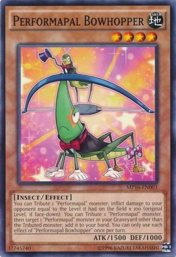 Performapal Bowhopper - MP16-EN003 - Common - Unlimited Edition Image is a stock photo of the card. You will receive the card in Lightly Played condition Condition: Lightly Played ATK/DEF : 1500 / 1000 Attribute : EARTH Card Number : MP16-EN003 Card Rules : Card Text : You can Tribute 1 "Performapal" monster; inflict damage to your opponent equal to the Level it had on the field x 100 (original Level, if face-down). You can Tribute 1 "Performapal" monster, then target 1 "Performapal" monster in your Graveyard other than the Tributed monster; add it to your hand. You can only use each effect of "Performapal Bowhopper" once per turn. Card Type : Not Available Edition : Unlimited Level : 4 Monster Type : Insect / Effect Name : Performapal Bowhopper Passcode : 37745740 Pendulum Scale : Rarity : Common Set : Be sure to visit our store for a wide selection of your favorite cards! We are running specials RIGHT NOW!! Shipping Options: ~Ships in a regular white envelope with a stamp for FREE! (THERE IS NO TRACKING INFORMATION AVAILABLE FOR THE ABOVE METHOD. SHIPPING TIME IS 4-10 BUSINESS DAYS) ~Ships in a TRACKEDbubble mailer for $5.99! ~Shipments are handled same or next business day. ~FREE SHIPPING for each additional card, so shop around our store!