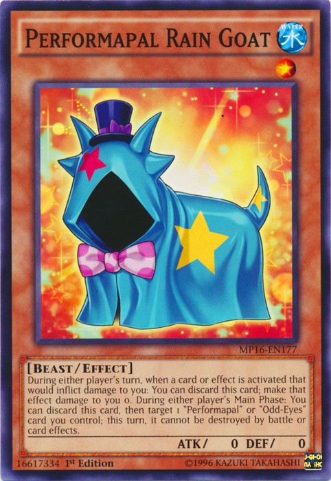 Performapal Rain Goat - MP16-EN177 - Common - 1st Edition Image is a stock photo of the card. You will receive the card in Lightly Played condition Condition: Lightly Played ATK/DEF : 0 / 0 Attribute : WATER Card Number : MP16-EN177 Card Rules : Card Text : During either player's turn, when a card or effect is activated that would inflict damage to you: You can discard this card; make that effect damage to you 0. During either player's Main Phase: You can discard this card, then target 1 "Performapal" or "Odd-Eyes" card you control; this turn, it cannot be destroyed by battle or card effects. Card Type : Not Available Edition : 1st Level : 1 Monster Type : Beast / Effect Name : Performapal Rain Goat Passcode : 16617334 Pendulum Scale : Rarity : Common Set : Be sure to visit our store for a wide selection of your favorite cards! We are running specials RIGHT NOW!! Shipping Options: ~Ships in a regular white envelope with a stamp for FREE! (THERE IS NO TRACKING INFORMATION AVAILABLE FOR THE ABOVE METHOD. SHIPPING TIME IS 4-10 BUSINESS DAYS) ~Ships in a TRACKEDbubble mailer for $5.99! ~Shipments are handled same or next business day. ~FREE SHIPPING for each additional card, so shop around our store!