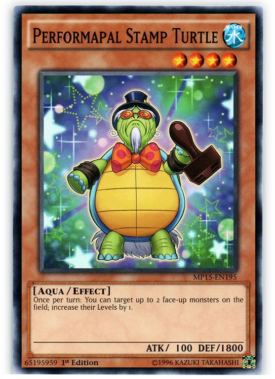 Performapal Stamp Turtle - MP15-EN195 - Common - 1st Edition Image is a stock photo of the card. You will receive the card in Lightly Played condition Condition: Lightly Played ATK/DEF : 100/1800 Ability : Attack #1 : Attack #2 : Attack #3 : Attribute : Water Card Number : MP15-EN195 Card Rules : Card Text : Once per turn: You can target up to 2 face-up monsters on the field; increase their Levels by 1. Card Type : EffectPendulum Monster Edition : 1st Finish : HP : Illustrator : Level : 4 Manufacturer : Monster Type : Aqua Name : Performapal Stamp Turtle Passcode : 65195959 Pendulum Scale : Rarity : Common Resistance : Retreat Cost : Set : 2018 Mega Tin Pack Stage : Weakness : Be sure to visit our store for a wide selection of your favorite cards! We are running specials RIGHT NOW!! Shipping Options: ~Ships in a regular white envelope with a stamp for FREE! (THERE IS NO TRACKING INFORMATION AVAILABLE FOR THE ABOVE METHOD. SHIPPING TIME IS 4-10 BUSINESS DAYS) ~Ships in a TRACKEDbubble mailer for $5.99! ~Shipments are handled same or next business day. ~FREE SHIPPING for each additional card, so shop around our store!