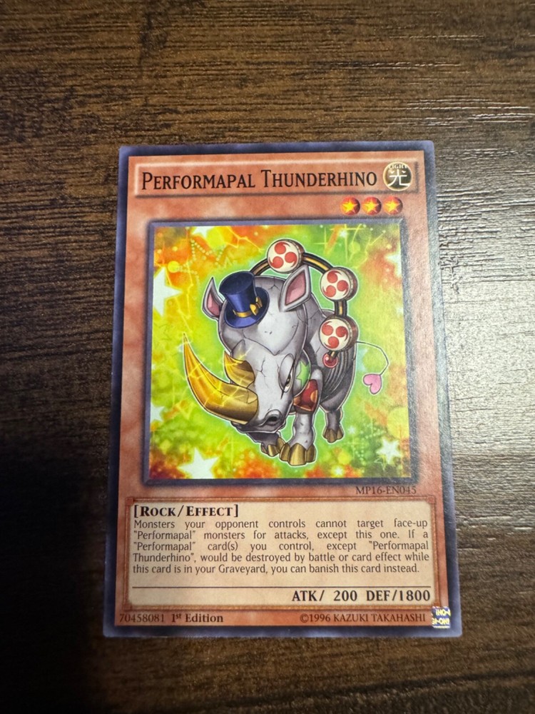 This is a rare and highly sought-after Performapal Thunderhino card from the 2016 Mega-Tins Mega Pack set. With a Light color attribute and a Rock creature/monster type, this card has a impressive 1800 defense/toughness and a powerful 200 attack/power. It is an Effect card type with a card number of MP16-EN045, and is manufactured by Konami. This card is a 1st Edition and is in English language, with a rarity of Common/Short Print. It is perfect for collectors and players of the Yu-Gi-Oh! TCG game. Don't miss out on the opportunity to add this card to your collection and take your game to the next level.