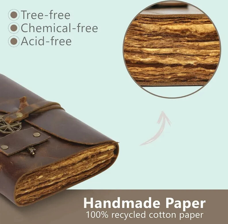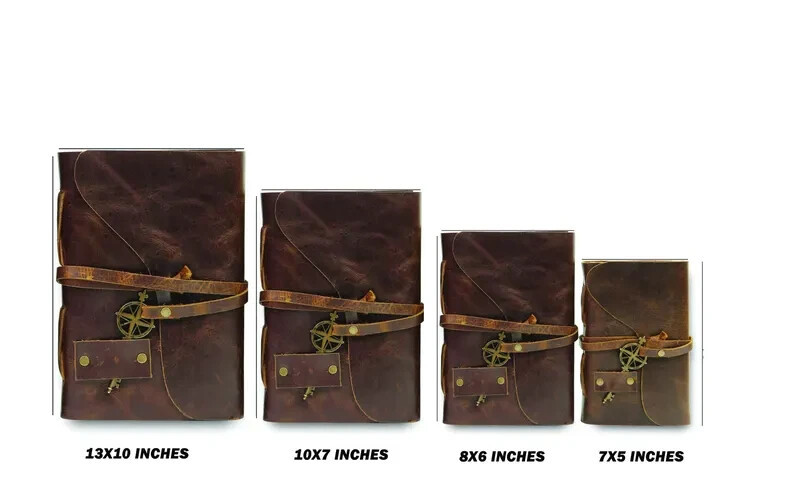 Vintage Leather journal Notebook - Sketchbook book of shadows Junk Journal, Writing journal, Handmade Deckle Edge paper Gifts for Women * Personalized Journal * Personalize the outside of your leather journal with free fire branded designs or your initials/name. The fire branding will be on the bottom right. • Vintage look With Brass key • Antique Compass Brass key • Thick Genuine Leather • Handmade deckle edge paper • 100 pages [ 200 side ] • Size - 7x5 inches 8x6 inches 10x7 inches 13x10 inches ● Antique Paper - Vintage Journal is made of unique vintage paper which looks like it was pulled from history. You will love the old looking handmade cotton paper (200 pages) which is unique to our vintage journals. ● Sturdy Binding, Leather Wraparound - Sturdy hand stitched binding to make sure that no paper comes out loose. ● Use Any Kind Of Pen - Sketch, Doodle, Write on your journal notebook with a Calligraphy Pen Fountain Pen, Brush Pen, Ball Pen, Acrylic Colours, Watercolor and many more. ◆ {Multiple Uses} ● The vintage leather journal is a perfect sketchbook, drawing journal, great gift for man & woman, book of shadows, grimoire journal , wicca journal , calligraphy journal, story writing, scrapbook, art journal, leather sketchbook, travel journal, journals for women and many more