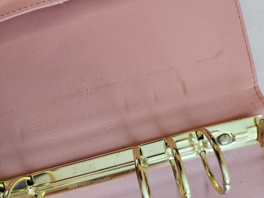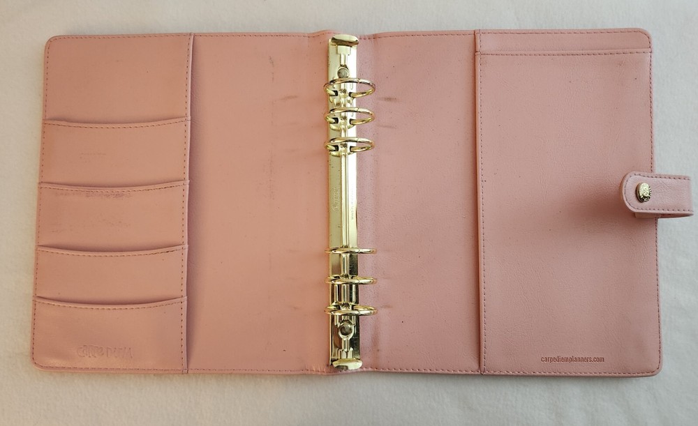 Carpe Diem A5 rings planner cover, pink. All hardware intact and funcitonal. No personalization. THERE IS SOME MINOR SCUFFING/STAINING on the inside of the planner. Price adjusted to reflect this. Ships from a smoke-free, pet-free home in the US via USPS. I do not ship internationally. Please feel free to message with any questions!