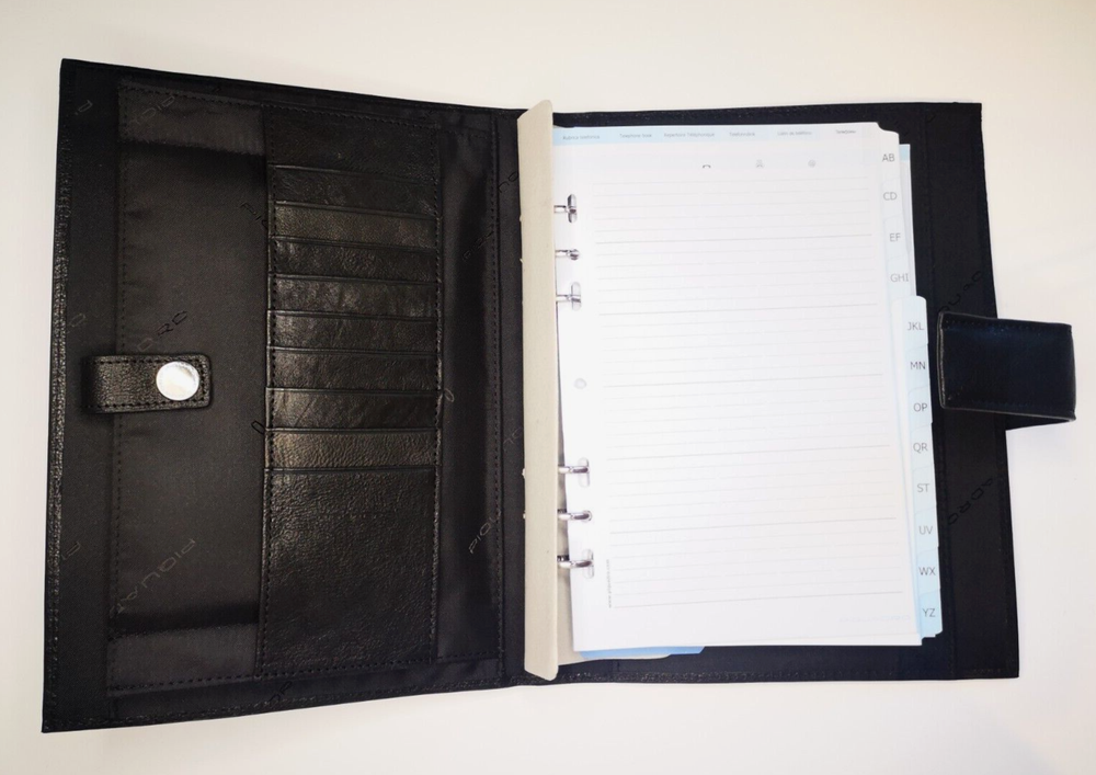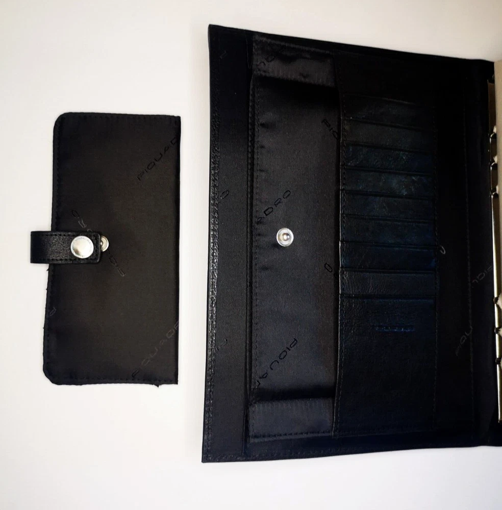 Piquadro Leather Agenda / Filofax / Organizer / Planner Large size, Black color , made in Italy Organizer, Filofax, inside 6 ring- bound planner No calendar papers included (you can add your own) Soft leather cover, metal magnet clip to close it Looking for quality you have found it 9x Credit cards or business card spots left side pocket with metal clip with 4 compartments for papers right side 2x compartments for papers Included papers (21.5cm * 14cm) : Telephone book Square notes Contacts Projects Notes Size: 25.5cm * 19cm * 4cm Weight: 740gr Material: soft leather & fabric inside Color: Black (colors in picture could be different than in real life) Keep most reached item in organizer, business and credit cards, handy and neat. The three values inspiring the brand - design, functionality and technological innovation - merge in the Piquadro products with the taste of Italian craftsmanship, the quality of fine leathers and attention to detail. In each collection Piquadro offers a wide range of bags, suitcases and small accessories in which the originality and elegance of the Italian style are combined with a studied practicality and reliability at the service of work, travel and the intense pace of contemporary life. Shipping Shipping will be made from Latvia. 1-2 day time. Shipping Free Worldwide . We are not responsible for any custom duty, additional taxes or fees levied by other countries. Europe - 15 business days Other world - 21 business days Return 100% Satisfaction Guarantee, If you are not satisfied with the product you purchased for any reason, please contact us for a return instruction within 7 days for a refund. Refund can be made for item price only. Return shipping cost will be paid by buyer. Please be aware that item may arrived when you aren't home and you may ignore the post office note. Normally, item shall be kept at your local post office for a while to pick up before return to us. Sometime please do not expect your package to be left at your door. The USPS Postal system considers this a risk and will hold your package for you at the post office for pick up. You will be notified by them that your package is there to be picked up. Feedback If you are considering giving a neutral or negative Feedback or a low DSR, do write to me and give me an opportunity to address your concerns first. We believe that all buyers on ebay are honest and caring people and all will get positive feedback from us. Important Color may be vary due to camera and different monitor setting. We are not responsible for any custom duty, additional taxes or fees levied by other countries. Buyer has to pay custom charge or additional taxes. C ontact It will be are pleasure to answer any questions/queries you might have. Please contact me by ebay message ONLY