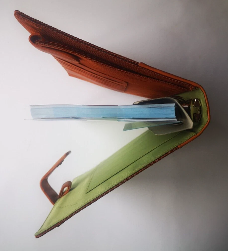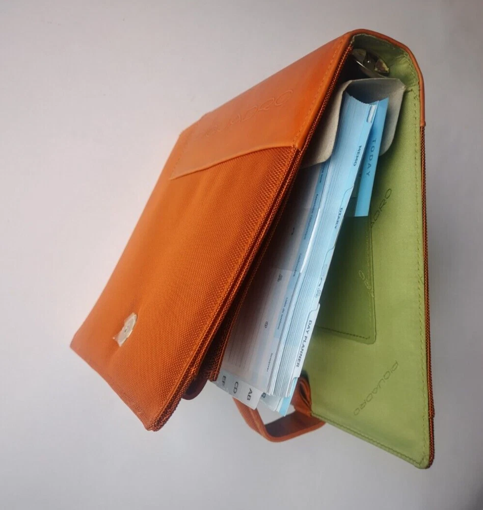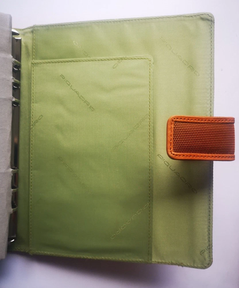 Piquadro Agenda / Filofax / Organizer / Planner Large size, Orange color outside, Orange/ Green inside, made in Italy -Few scratches on left side of cover in leather- Organizer, Filofax, inside 6 ring- bound planner, you can add your own pages Synthetic and leather cover, metal magnet clip to close it 6x Credit cards or business card spots 2x both side pockets for papers Leather loop for holding pen Included papers (21.5cm * 14cm) : Telephone book Ideas Appointments Contacts Goals Notes Size: 24cm * 19cm * 4cm Weight: 600gr Material: leather and synthetic Color: Orange outside, inside green and orange (colors in picture could be different than in real life) Keep most reached item in organizer, business and credit cards, handy and neat. The three values inspiring the brand - design, functionality and technological innovation - merge in the Piquadro products with the taste of Italian craftsmanship, the quality of fine leathers and attention to detail. In each collection Piquadro offers a wide range of bags, suitcases and small accessories in which the originality and elegance of the Italian style are combined with a studied practicality and reliability at the service of work, travel and the intense pace of contemporary life. Shipping Shipping will be made from Latvia. 1-2 day time. Shipping Free Worldwide . We are not responsible for any custom duty, additional taxes or fees levied by other countries. Europe - 15 business days Other world - 21 business days Return 100% Satisfaction Guarantee, If you are not satisfied with the product you purchased for any reason, please contact us for a return instruction within 7 days for a refund. Refund can be made for item price only. Return shipping cost will be paid by buyer. Please be aware that item may arrived when you aren't home and you may ignore the post office note. Normally, item shall be kept at your local post office for a while to pick up before return to us. Sometime please do not expect your package to be left at your door. The USPS Postal system considers this a risk and will hold your package for you at the post office for pick up. You will be notified by them that your package is there to be picked up. Feedback If you are considering giving a neutral or negative Feedback or a low DSR, do write to me and give me an opportunity to address your concerns first. We believe that all buyers on ebay are honest and caring people and all will get positive feedback from us. Important Color may be vary due to camera and different monitor setting. We are not responsible for any custom duty, additional taxes or fees levied by other countries. Buyer has to pay custom charge or additional taxes. C ontact It will be are pleasure to answer any questions/queries you might have. Please contact me by ebay message ONLY