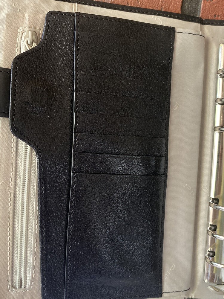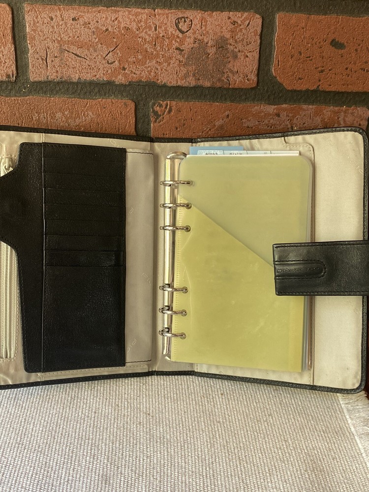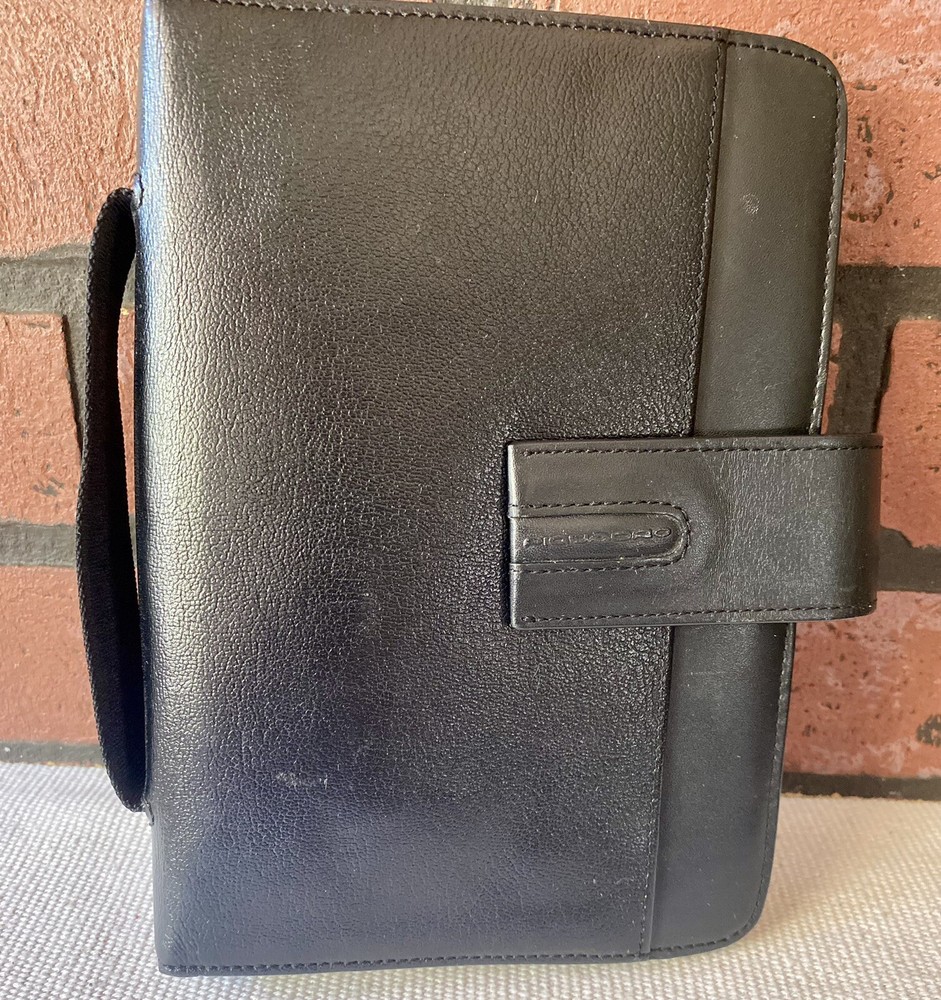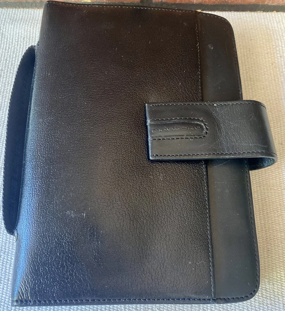 Stay organized and stylish with this Piquadro leather agenda planner organizer. Crafted in Italy, this small ring-bound planner is perfect for daily use. Keep track of your appointments and to-do lists with its daily format, while the original Piquadro box keeps it safe when not in use. The brand, Piquadro, is known for their high-quality leather materials and attention to detail. This planner is no exception. With no calendar year specified, it can be used for any year, making it a versatile choice. Whether for business or personal use, this Piquadro leather agenda planner organizer is a must-have accessory. great organizer, needs new paper. This is pre owned and from around 2018.