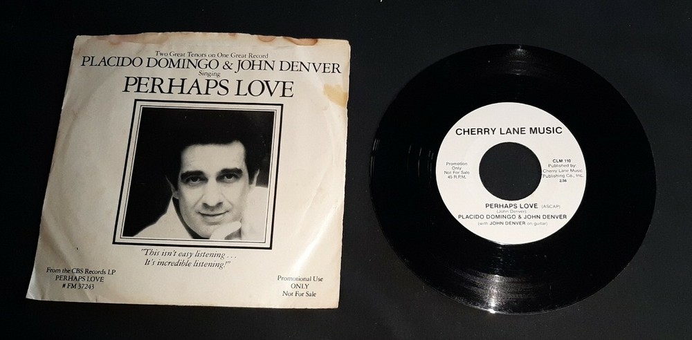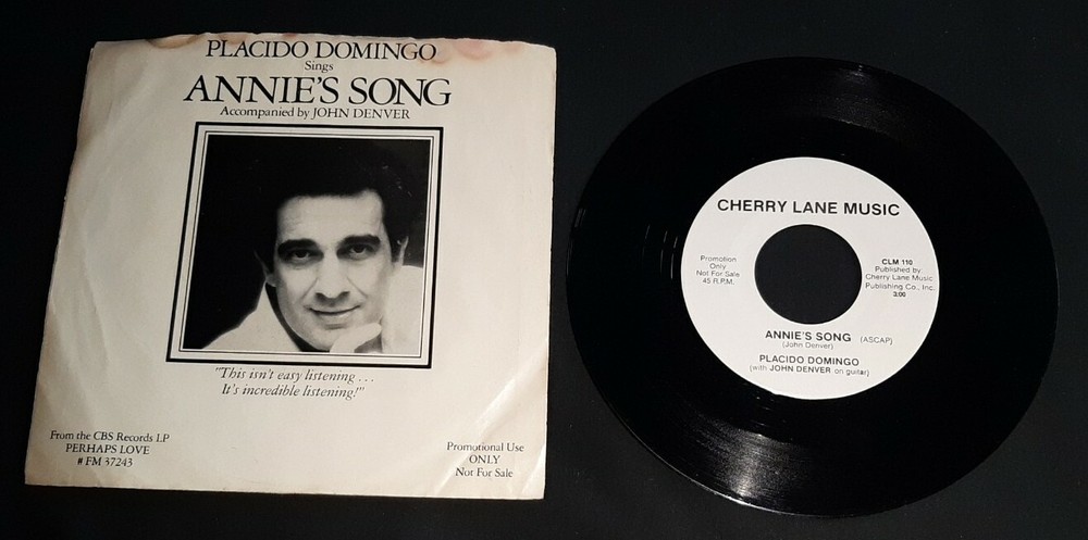 Placido Domingo John Denver promo 45 Annie's Song / Perhaps Love Cherry Lane Music CLM 110 ex PS. Vinyl is in excellent condition with a few minor light scratches and marks, glossy and nice. Picture sleeve is included in very good condition with some splits, creasing, tears, staining, discoloration and wear.