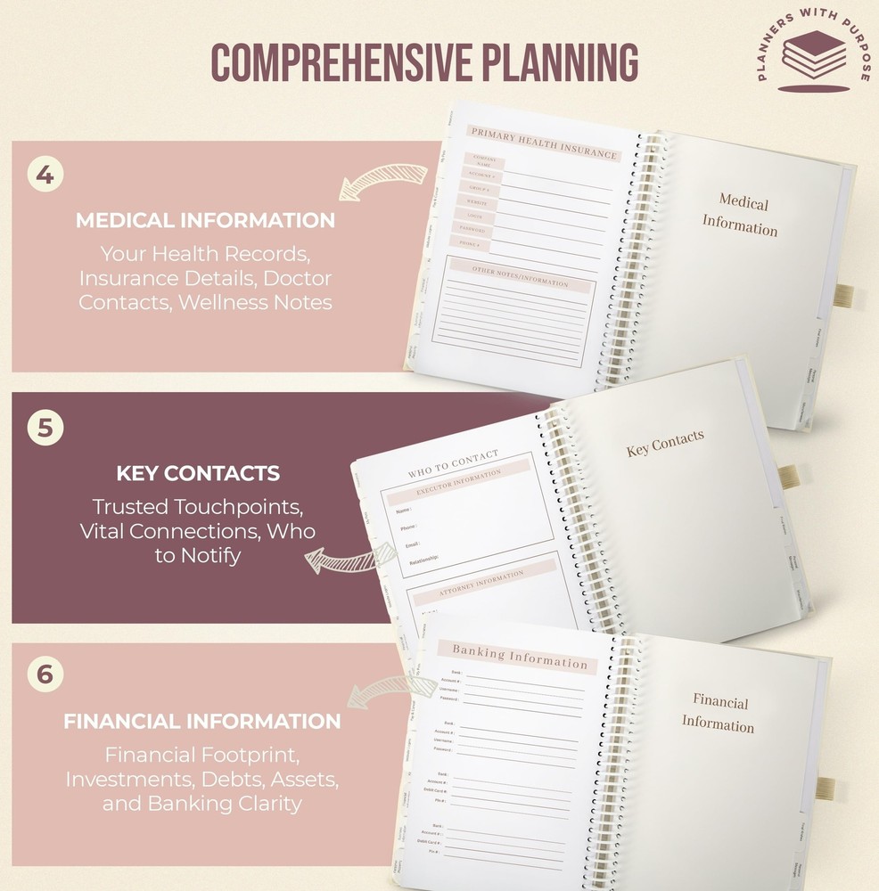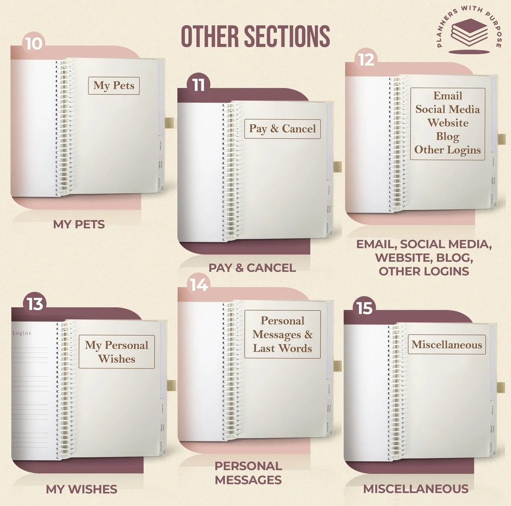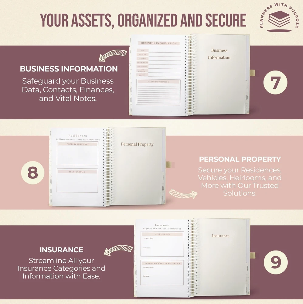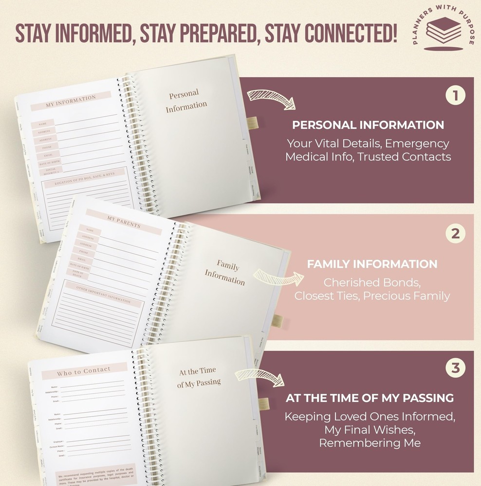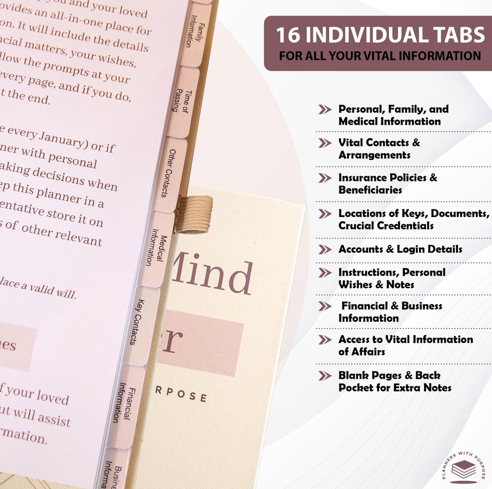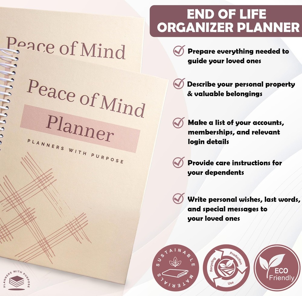 Planners with Purpose End of Life Planner - Guided Final Arrangements When I'm Gone Workbook Organizer Notebook for Beneficiary Info, Will Preparation, Last Wishes, Funeral Planning - Peace of Mind B5 Our Ultimate End of Life Planner is a comprehensive, guided organizer designed to simplify the process of planning for the inevitable. This high-quality vegan hardcover planner is B5 size, making it compact enough to store safely while still providing ample space for all necessary information. This planner guides you through the process of documenting your final arrangements, including your last wishes and funeral planning. It provides a comprehensive guide to ensure that you leave no stone unturned, reducing the burden on your loved ones during a difficult time. The durable hardcover ensures that your important information is well-protected, while the sleek design with 16 individual tabs adds a sophisticated touch. This planner is designed to be user-friendly, with clear instructions and easy-to-navigate layouts that make the process as stress-free as possible. One of the standout features of this planner is the dedicated section for beneficiary information, praised by users for its convenience and ease of use. This section allows you to keep all necessary details in one place, ensuring that nothing is overlooked. This planner is also an excellent tool for will preparation, providing step-by-step guidance to ensure that all important aspects are covered. With the Planners with Purpose Peace of Mind Planner, you can have peace of mind knowing that your loved ones will be well-informed and prepared. Choose the Planners with Purpose Peace of Mind Planner for a simplified, comprehensive approach to end-of-life planning. MORE BENEFITS COMPLETE END-OF-LIFE PLANNER FOR ESSENTIAL INFORMATION: Ensure your loved ones have everything they need with this comprehensive estate planning workbook. Our peace of mind planner includes 16 organized sections to record legal, medical, financial, and final wishes, helping to reduce stress and confusion during difficult times. ESTATE & LEGACY ORGANIZER WITH GUIDED PROMPTS: Our end-of-life planning book features pre-printed prompts to help you document medical details, will instructions, power of attorney, life insurance policies, asset distribution, funeral preferences, and passwords—ensuring nothing important is overlooked. DURABLE, LAY-FLAT DESIGN FOR EASY WRITING & ACCESSIBILITY: Designed for convenience, this estate organizer book is B5 size (7.5” x 10”) for easy reading and writing. The spiral-bound, lay-flat format makes it simple to fill out, while the vegan hardcover, thick 120gsm paper, and expandable pockets keep your documents safe and secure. ESSENTIAL FINAL ARRANGEMENTS & EMERGENCY PREPAREDNESS GUIDE: Our legacy planner serves as an end-of-life checklist to help families organize advance directives, beneficiary details, debt tracking, digital assets, and personal messages—providing peace of mind that all affairs are in order. IDEAL GIFT FOR SENIORS, CAREGIVERS & ESTATE EXECUTORS: This when I’m gone planner is perfect for aging parents, retirees, caregivers, and executors who need a structured way to manage will preparation, trust planning, and important family documents. A must-have for long-term care planning and senior organization.