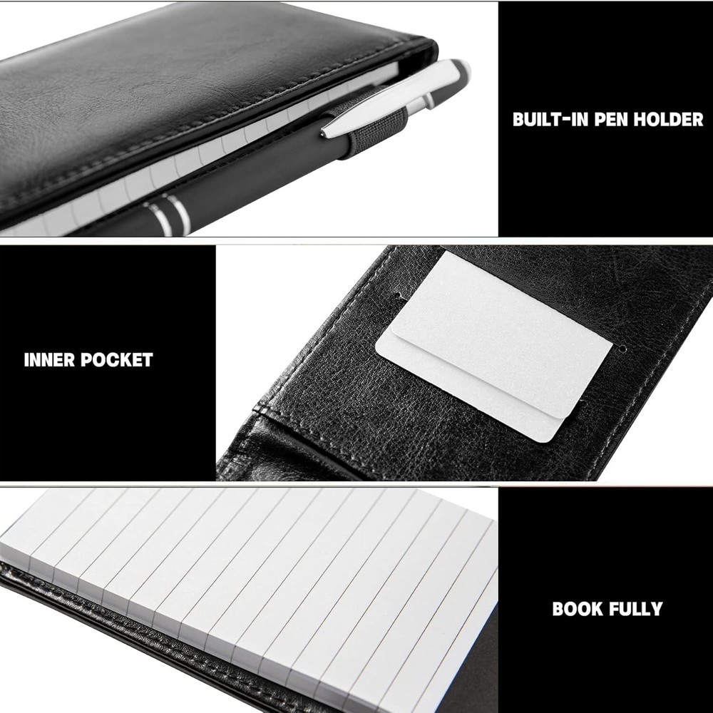 Pocket Notebook Leather 3 x 5 inch Hard Cover Journal Mini Notepad with Pen Pocket Notebook This pocket-sized notebook is designed for comfort and portability, making it easy to carry in your pocket, purse, or bag. It's perfect for everyday use and is loved by both men and women. Pocket Notebook with Pen Includes a retractable metal pen that's ready to use right away. The pen fits securely in the notebook's pen holder, ensuring durability and preventing smudges. Ideal for jotting down important information on the go. Versatile Use These small notebooks are perfect for professionals, students, adults, scientists, and anyone in need of a handy notepad for work, study, or travel. Use it as a travel journal, diary, or everyday notepad. Our Services Thank you for trusting our Pocket Notebook with Pen. We are committed to providing quality products and excellent customer service. Small Notepad Set 10 Pieces Small Notepad Holder Set: 1 x 3.4 x 5.4 inch Pocket Notepad Holder 1 x 50 Sheets 3 x 5 Inch Notepad 1 x Metal Pen 8 x 30 Sheets 3 x 5 Inch Notepads
