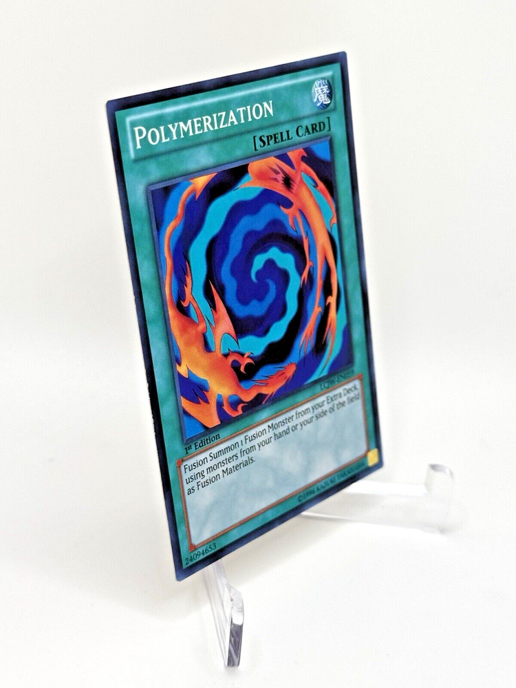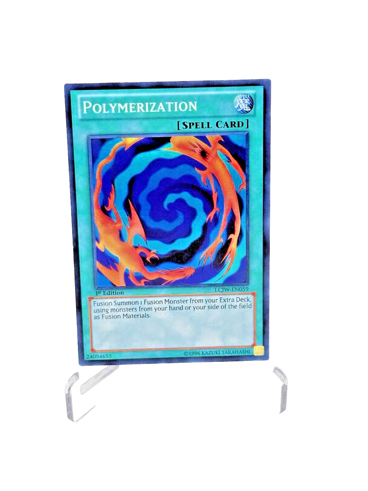 This Yu-Gi-Oh! TCG card is a Super Rare Spell-Normal type from the Legendary Collection 4: Joey's World set. The card name is Polymerization and it has a Card Number of LCJW-EN059. The card is in English and has a Holo finish. It is manufactured by Konami and belongs to the CCG Individual Cards and Collectible Card Games categories. This card is perfect for collectors and players alike, and is a must-have for any Yu-Gi-Oh! fan. Its rarity and unique abilities make it a valuable addition to any collection, and its card type is sure to catch opponents off-guard. Don't miss out on the opportunity to own this incredible card.