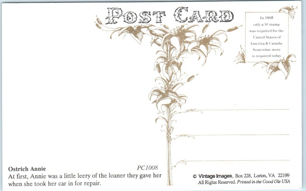 Postcard - Ostrich Annie P-78607 Postcards from various collections. Many used and most show signs of use. see pictures for details on condition. To get combined shipping rate items must be paid for at the same time. Please verify your invoice is correct before you pay. If shipping charges or anything else is not correct please email me so I can try to assist before you pay. Once paid for I am not able to add additional items to the combined shipping. We ship using US Mail, Items are packed and shipped by the next business day. Speed of delivery may take longer during peak shipping seasons.