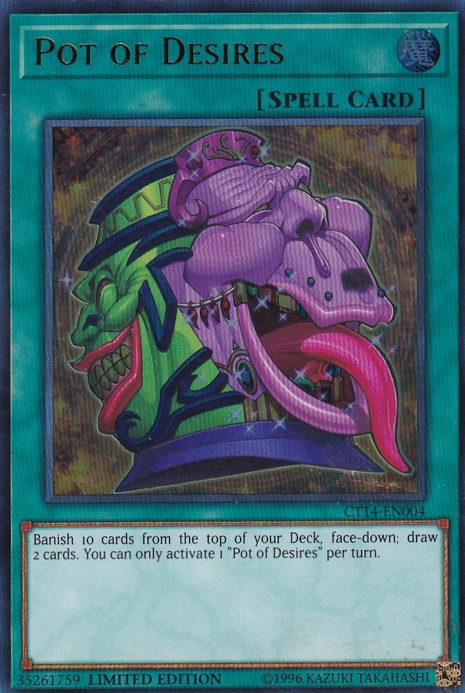 Unleash the power of strategic gameplay with the iconic "Pot of Desires" from the 2017 Mega-Tins set, a must-have for any Yu-Gi-Oh! TCG enthusiast. This ultra-rare card, numbered CT14-EN004, features a striking foil finish that encapsulates the essence of the beloved series in a gleaming masterpiece. As a limited edition collectible by Konami, "Pot of Desires" stands out not only for its impressive appearance but also for its potential to elevate your deck with its unique abilities. Whether for competitive play or for the sheer joy of collecting, this card is an exceptional addition to any Yu-Gi-Oh! assortment. I use a stock photo for the back of the card, I use original scan for front of card.