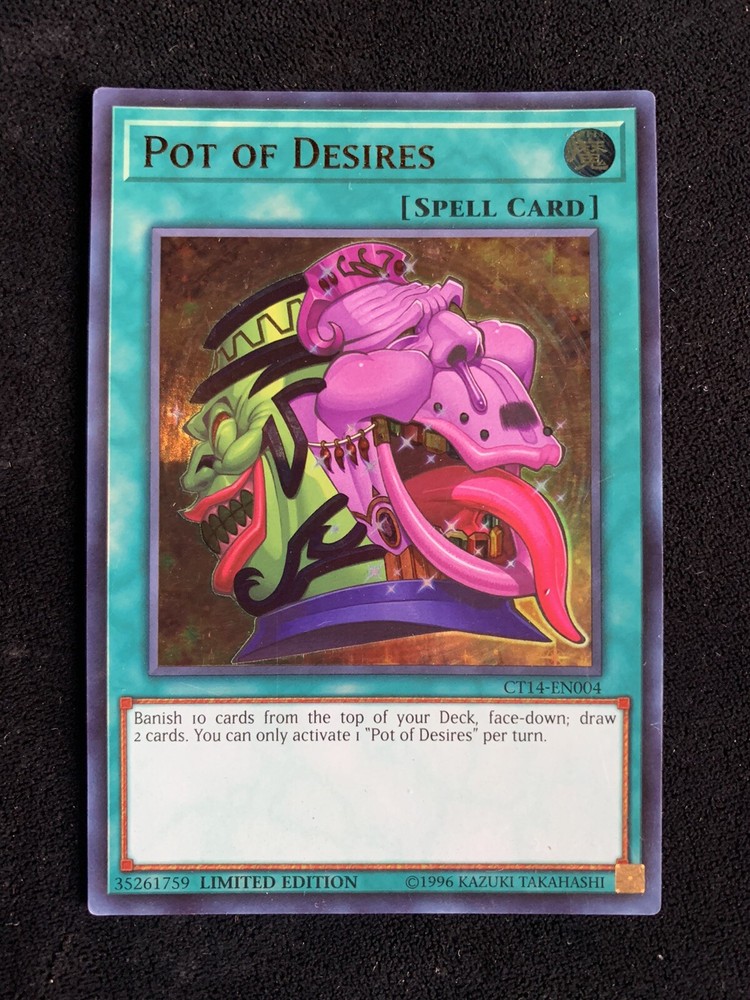 Pot of Desires CT14-EN004 2017 Mega-Tins Limited Edition-VLP/NM Pot of Desires holo - Limited Edition CT14-EN004 Front is in excellent condition (micro hair scratches on foil The back has light micro hair scratches as well but in excellent condition