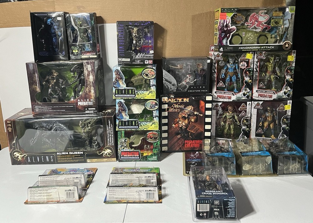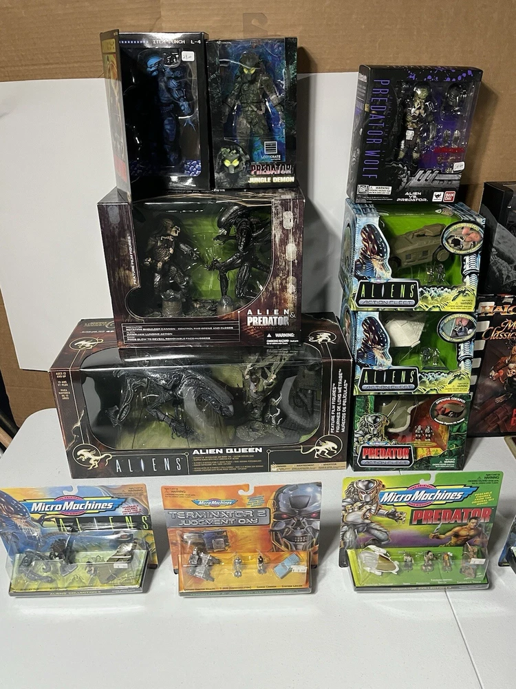23 piece predator alien collection. Featuring Mcfarlane, Galoob Micro Machine Action fleet, S.H monster Arts and more. All new in box and sealed. Except for the Predator model kit. Its contents are sealed inside but exterior plastic is missing. Please feel free to ask questions. There are many rare pieces here. Like the micro machines and the predator wolf heavily armed version from SH monster arts. Free fast shipping from New York.