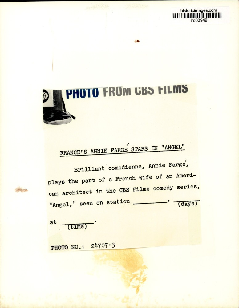 ebay template Note: Please study the images carefully to determine the condition of this vintage photograph, as it may not be in perfect condition. It may contain wrinkles, cracks, and possibly even tears due to its age and how it was handled before it got to us. A scanner may interpret colors and contrast differently than human eyes will, so it is possible that the actual photograph may be slightly darker or lighter in person. This vintage photograph is offered for sale as a collectible item and conveys no transfer of copyright. Press Photo Actress Annie Fargé - lrq03949 Brilliant comedienne, Annie Farge, plays the part of a French wife of an American architect in the CBS Films comedy series, "Angel," seen on station... Photo measures 7 x 9 inches. Photo Is dated -- none. PHOTO FRONT PHOTO BACK Historic Images Part Number: lrq03949 FAQs Q: Can I just download a digital version instead? A: No, we sell only vintage originals and do not make or distribute any copies, including digital ones. Q: Do you combine shipping and invoices? A: Multiple photos won on the same seller ID combine automatically through the eBay checkout process. If you encounter problems with this, send us a message via eBay messaging and we will send you an invoice. Due to eBay limitations, we cannot combine items won on our different seller IDs for a single shipping charge. Q: How quickly do you ship the items once paid? A: We ship within one business day after your payment clears. If you do not receive an "order shipped" email from us by the close of the second business day from submitting payment, please e-mail us via eBay messaging. Q: How do you make sure my photograph arrives safely? A: We package each order between two cross-corrugated pieces of cardboard to ensure that the package is as difficult to bend as possible. We then wrap each order in a plastic sheet to help protect against moisture. We want you to rest assured that we take every precaution to ensure that the photograph you receive will be in the same condition in your care as it was in ours. Q: Will the "Historic Images" watermark be on my photo when I receive it? A: No. This is a digital watermark we use to protect our images. It is not printed on the photo. Q: What are your office hours? A: eBay for us is a business, and a very fun one to be in! We are open M-F 9 to 5 (CST). Therefore, we do not return e-mails and phone calls over the weekend. We observe the following holidays: New Years Day, Memorial Day, Fourth of July, Labor Day, Thanksgiving and the day after Thanksgiving, Christmas Eve and Christmas Day. Q: Where did all these vintage photos come from? A: These original vintage photographs are from various news service and newspaper photo archives from locations around the country including: Boston, Detroit, Tampa, Chicago, Denver, Seattle, New Orleans, Milwaukee, Portland, Spokane, and more. We do not copy or reproduce any photographs -- every item is a unique vintage piece that was housed in a news archive. Q: Can I use this photograph in my book/blog/website? A: The short answer is no. There is no transfer of copyright for republication or reproduction with these photographs when you purchase them, and only photographs taken before 1923 are currently automatically in the public domain. Permission from the copyright holder, which usually can be identified from the back of each photo, must be sought to republish or reproduce the image for any purpose. Q: Do you relist items (in case I miss an auction ending)? A: Auction items that receive no bids are relisted in our store (historicimages-store on eBay) as a fixed-price item and at a higher price than the starting auction price. Q: Do you leave feedback? A: Yes, we always leave feedback for buyers. Our software monitors when our buyers leave us feedback, then notifies us that we can leave feedback for the buyer. Rest assured, if you leave feedback, we will do the same! Check out our family of eBay IDs: historicimages01 Sports Photos historicimages02 Entertainment Photos historicimages03 Americana Photos historicimages04 International & War Photos historicimages05 Transportation Photos historicimages06 Photos of All Subjects historicimages07 Entertainment Photos historicimages08 Newsworthy Photos historicimages09 Entertainment Photos historicimages10 Sports Photos historicimages-store Our largest fixed-price selection historicimages-gallery Hand-picked photos Saturday night auctions About Us Historic Images was formed in September 2009, with a handful of scanners working out of a basement to digitize newspaper photo archives. We have since moved out of the basement, and we can now archive thousands of photos per day. Our company has worked with magazines and newspapers from Detroit, Boston, Denver, Seattle, Tampa, Chicago, and New Orleans, just to name a few. We are constantly adding to our inventory, and have assembled an archive of millions of photos to date. As our company evolved, we began our eBay business, which brings thousands of fresh auctions per week to the world's largest online auction marketplace. Our custom software systems and team of great employees allow us to efficiently scan and sell large photo archives online. At the very core of our company's DNA is a strong commitment to customer satisfaction and strict integrity for our product. Our promise to you is that we will do everything in our power to provide you a great buying experience. Copyright 2009 - Present, Historic Images, Inc. Sell Smarter with Kyozou. Inventory and Ecommerce Management