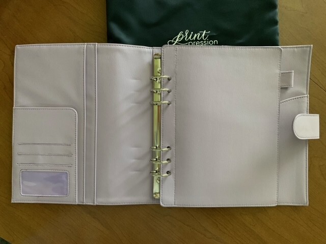 This Print Pression A5W rings planner cover is new. While the photo looks like it is white, it is actually a pale lilac. It will come with the dust bag.