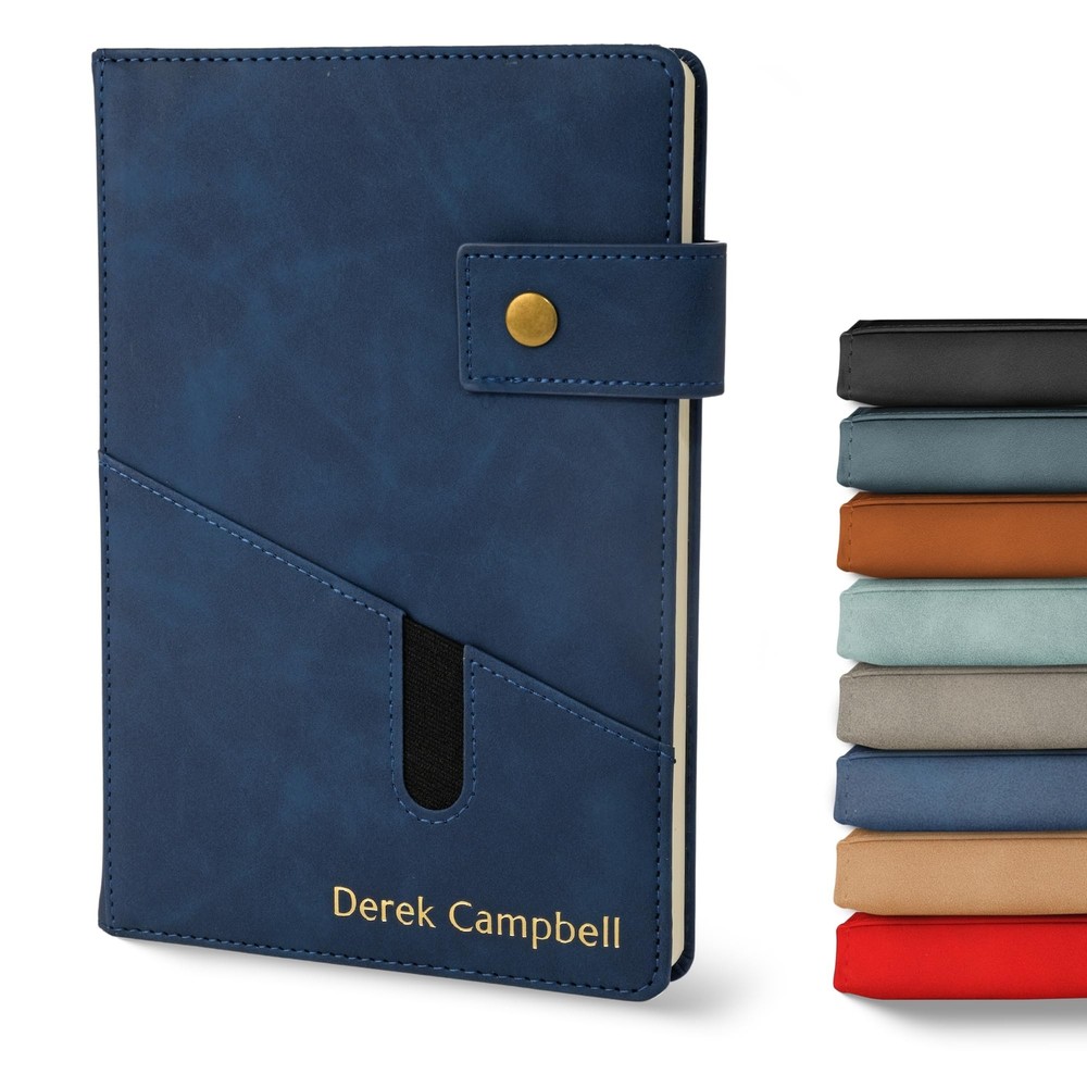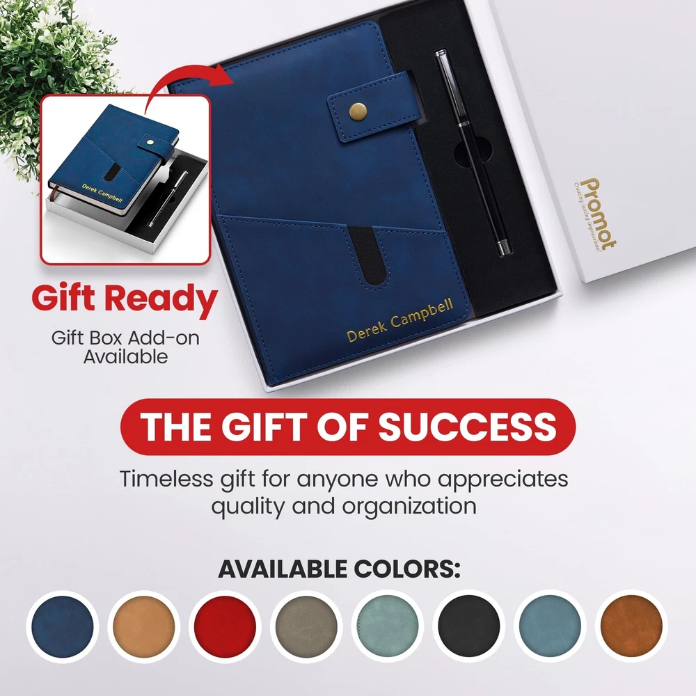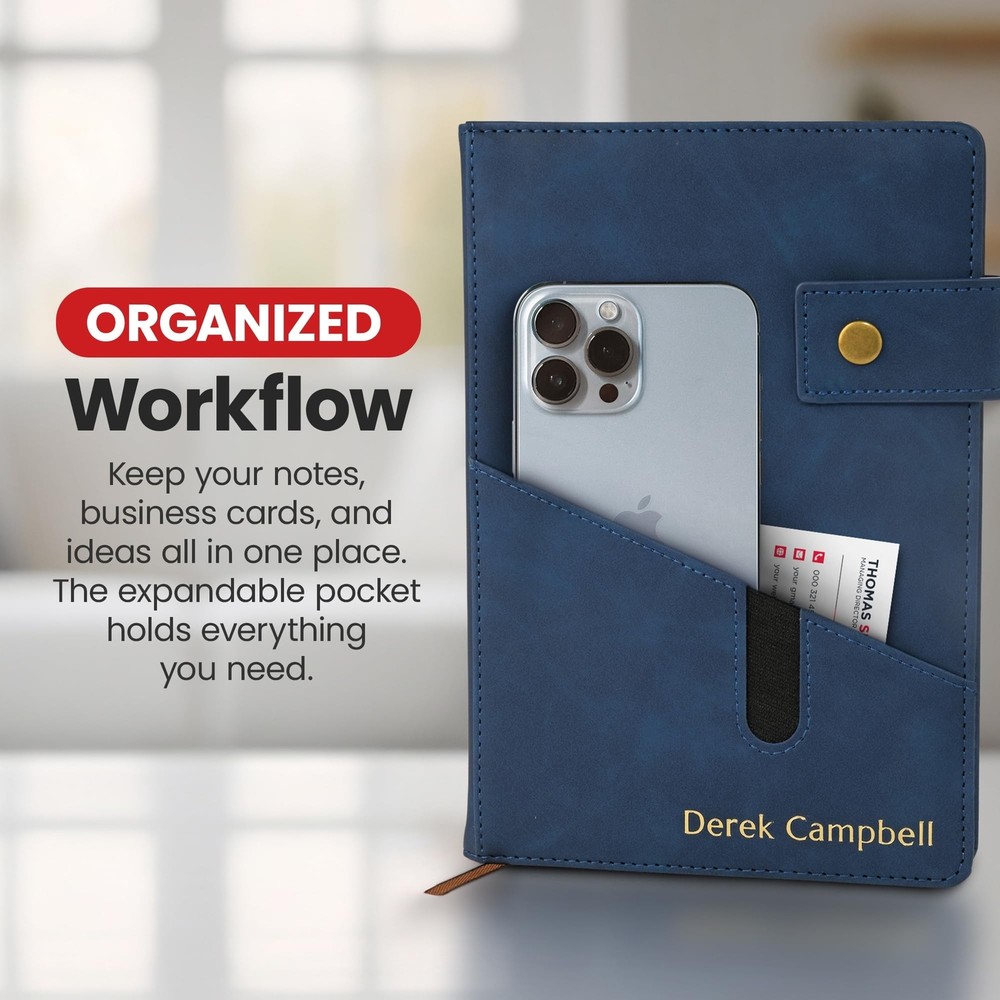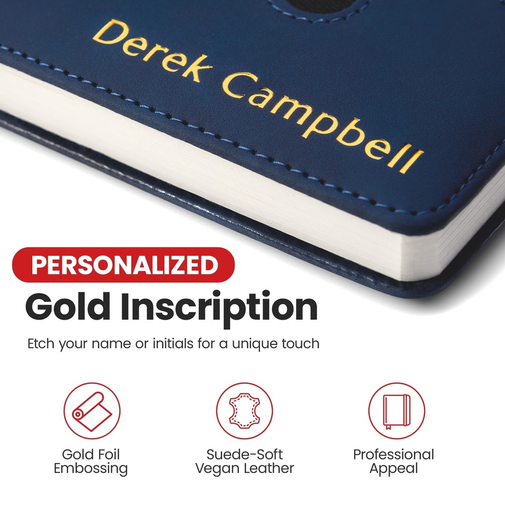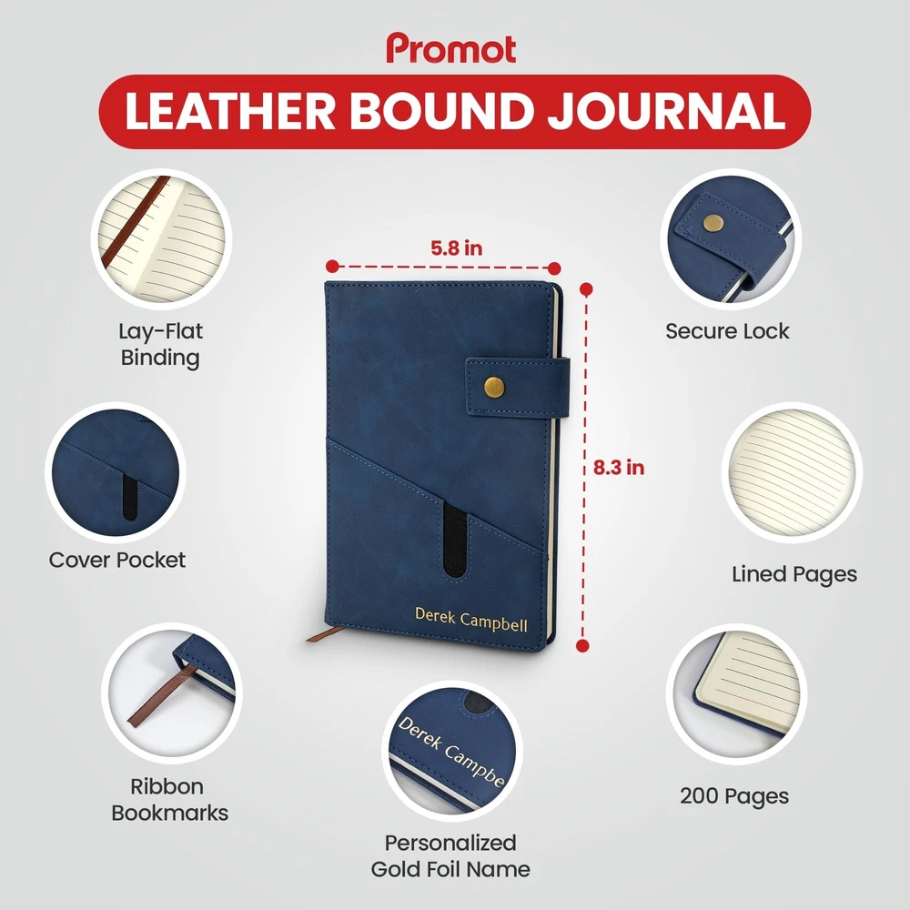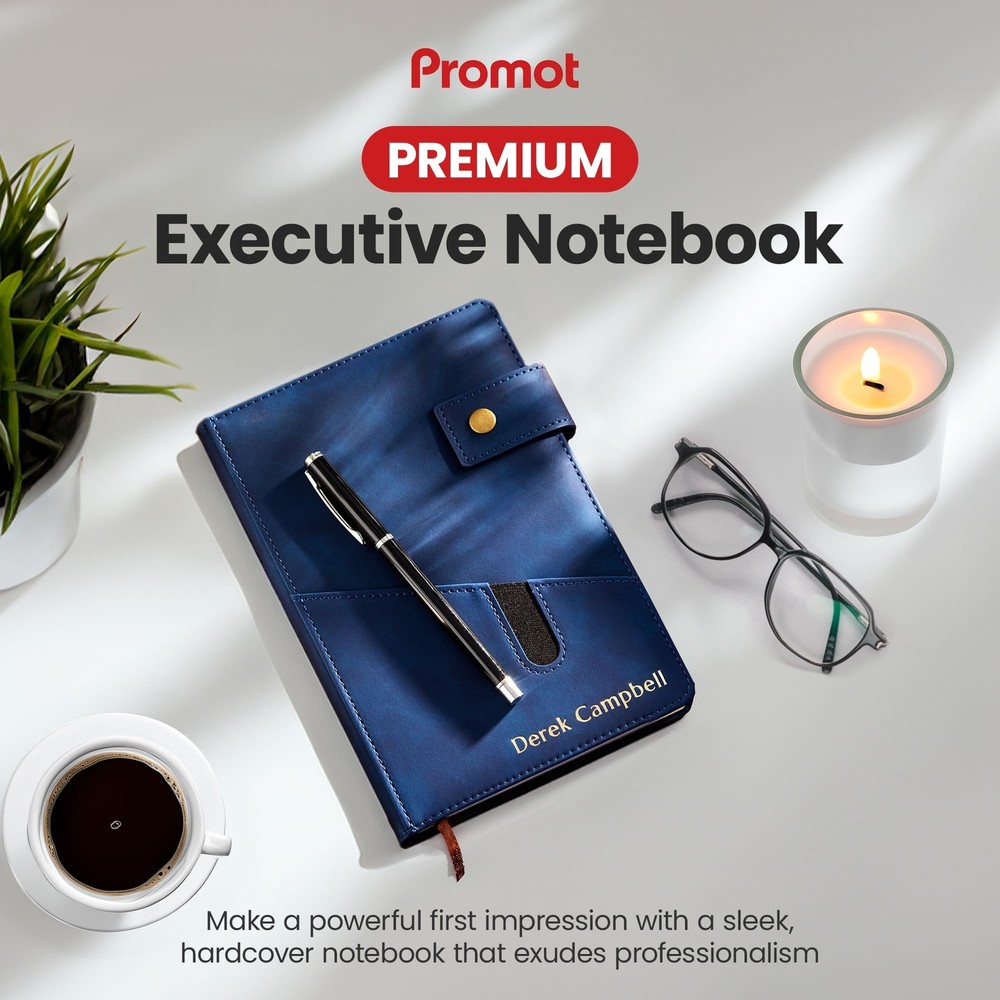 Promot Personalized Notebook - A5 Lined Leather Bound Journal for Writing Women Men - Hardcover Executive Notebook, Daily Journal, Travel Diary, Gift Idea, Custom Embossed Text with Gold Metallic Foil Description Features: Your Personalized Notebook: Make a statement with gold embossing customization for your name, infusing an air of sophistication into this unique leather-bound journal. Your travelers' notebook becomes a canvas of your preferences, click "Customize Now" to begin. Make a bold statement and add a touch of unparalleled elegance to your notebook today. Convenient Pocket & Lock Design: Stay organized on the go with a handy pocket, perfect for storing loose notes, business cards, or other essentials. It also comes with a lock to keep the travel journal pages secure. Suede-Soft Vegan Leather: Immerse yourself in the luxurious feel of this journal for men and women, featuring a smooth suede finish that offers a tactile and sophisticated feel that elevates your writing experience. Endless Possibilities: Whether for daily journaling, sketching, note-taking, or a diary for writing, this versatile A5 lined notebook adapts to your creative needs, making it a perfect gift for writers, artists, executives, and professionals. Memorable Gift: Impress your loved ones with a personalized gift that combines practicality and style. This custom leather notebook is a thoughtful present for birthdays, anniversaries, or any special occasion. Choose from 8 colors: Blue, Sky Blue, Black, Storm Blue, Brown, Red, Gray, and Tan. Product Details: Brand: Promot Color: Blue Theme: Book Sheet Size: A5 Pages: 200 Pages Cover Material: Faux Leather Style: Executive Notebook Ruling Type: Ruled Special Feature: Lock Number of Items: 1 Manufacturer: The Rubber Stamp Factory Corp. Brand: Promot Item Weight: 14.4 ounces Product Dimensions: 5.7 x 0.78 x 8.4 inches Color: Blue Cover Material: Faux Leather Number of Items: 1 Size: A5 Ruling: Ruled Sheet Size: A5 Manufacturer Part Number: PNB01-A5-BLUE Date First Available: August 7, 2023 Handling We will ship all orders within 3 business day of payment. Delivery We Do Not Ship Outside of the Continental US. Return Policy All items qualify for returns within 30 days of receipt. Buyer is responsible for return shipping on any item that is not damaged. Feedback We take our reputation seriously, we buy and sell online, so we understand the value of trust. If you are unsatisfied with your order, please contact us and we will work with you to resolve it to your satisfaction.