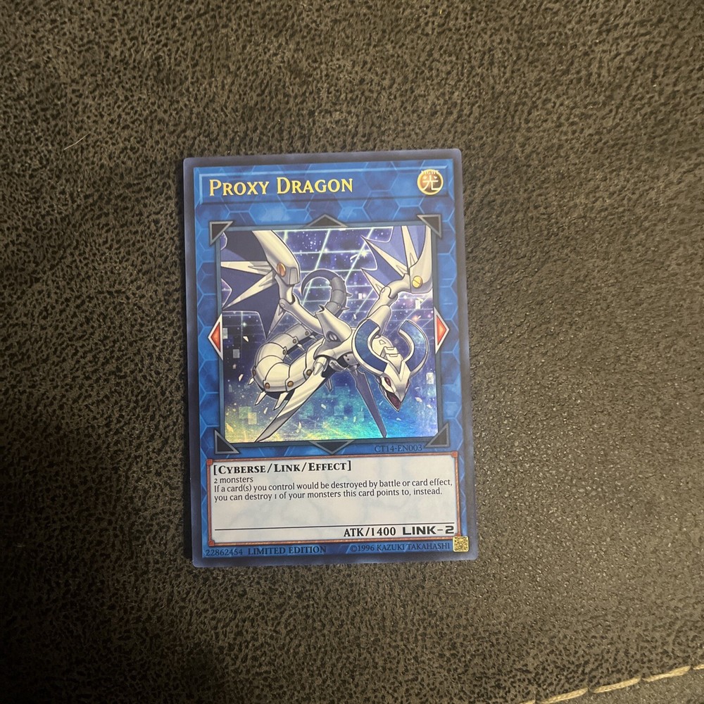 This is a highly sought-after Proxy Dragon card from the Yu-Gi-Oh! CCG. The card is ultra rare and comes from the CT - Mega Tins 2017 Promos set. It features a stunning dragon design and is a limited edition card. The card is in near mint condition, making it an excellent addition to any collection. Whether you're a seasoned collector or just starting out, this card is a must-have for any Yu-Gi-Oh! fan. Don't miss out on the chance to own this incredible card!