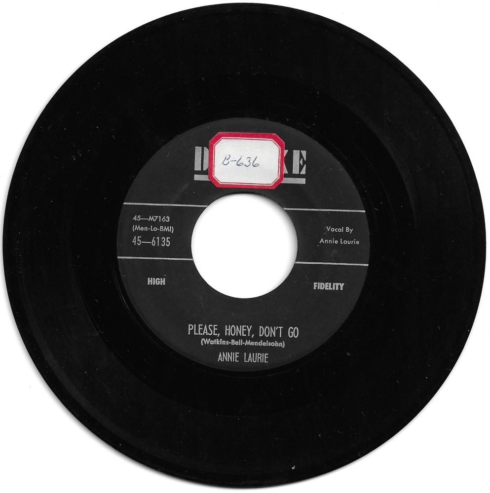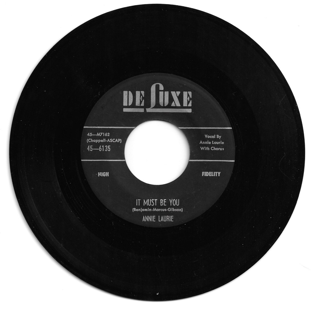ANNIE LAURIE DE LUXE 6135 IT MUST BE YOU B/W PLEASE HONEY DON'T GO THIS IS AN ORIGINAL RECORDING RELEASED IN 1957. THE RECORD HAS A FEW LIGHT SCRATCHES AND SCUFFS AND A STICKER ON THE FLIP. PLAYS VERY WELL VG+ ALL RECORDS ARE PLAY GRADED AND I GRADE CONSERVATIVELY. IF YOU ARE NOT COMPLETELY SATISFIED, CONTACT ME AND WE WILL WORK IT OUT. BELOW ARE THE TERMS OF MY AUCTIONS. 1. PAYMENT IS DUE WITHIN 3 DAYS OF CLOSE OF AUCTION. 2. I RESERVE THE RIGHT TO CANCEL ANY BID AT MY DISCRETION. IF YOU HAVE ANY QUESTIONS, PLEASE EMAIL ME BEFORE BIDDING. PLEASE CHECK OUT MY OTHER AUCTIONS AS WELL. THANK YOU FOR LOOKING.