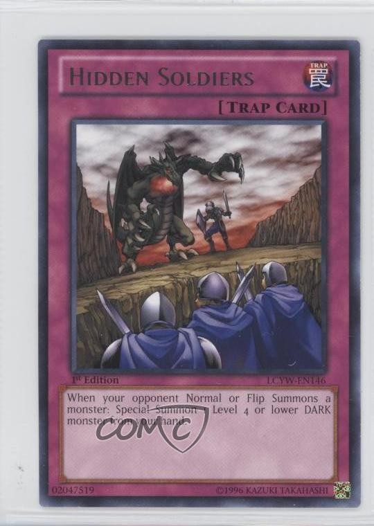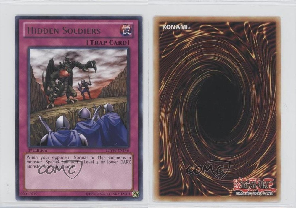 2012 Yu-Gi-Oh! Legendary Collection 3: Yugi's World - Mega-Pack [Base] - 1st Edition #LCYW-EN146 R - Hidden Soldiers COMC Item: 9299225 - YuGiOh Card - Featuring Hidden Soldiers Search for more: 2012 Yu-Gi-Oh! Legendary Collection 3: Yugi's World Search for more: 2012 Yu-Gi-Oh! Legendary Collection 3: Yugi's World - Mega-Pack [Base] - 1st Edition View all of our Listings Auctions Buy It Now About Us Located in the beautiful Pacific Northwest, COMC (Check Out My Cards) is the world's largest consignment service for trading card singles. More than 10,000 people have used our consignment service to list over 50 million trading cards. Find out how we can help you consign your items on eBay by contacting us through eBay messaging. COMC -- "The Safe & Easy Way to Buy & Sell" Raw Condition for Modern Cards Unless otherwise noted, raw modern cards are listed in Near Mint-Mint condition or better. A NM-MT card appears to be Mint at first glance, but upon closer inspection, may exhibit some of the following: minor print defects (e.g. roller marks, print line, dimple), minor scratches, slight edge wear, and slight corner wear. Centering is clearly visible in the images provided and does not factor into our condition assessment. Raw Condition for Vintage Cards Unless otherwise noted, raw vintage cards are listed in Excellent condition or better. An EX card may exhibit some of the following: minor rounding of corners, surface wear, print defects, light scratches, and slight edge wear/chipping. Centering is clearly visible in the images provided and does not factor into our condition assessment. Domestic Shipping Combined shipping for multiple items is available. To receive combined shipping, please ensure all desired items are in your eBay shopping cart before proceeding to checkout. eBay limits orders to 40 items per order. We automatically combine multiple orders placed on the same day. If you place multiple orders on the same day, please contact us to request a refund of applicable shipping costs. Signature confirmation may be required on invoices over $400. All cards are protected and shipped securely. International Shipping COMC offers eBay's International Shipping (EIS) for international orders under $2,500* (see country exceptions below). All duties and import fees are paid at checkout; in the rare event that there are additional import fees upon delivery, these are borne by the buyer. EIS packages route through a shipping hub in Erlanger, KY before shipping to their final destination. Please note that EIS does not allow for combined shipments. The shipping rates are determined by eBay and cannot be adjusted. *Maximum sale price exceptions: Colombia, Kuwait ($2,000); Taiwan ($1,539); Chile, Costa Rica, Guatemala, Honduras, Trinidad and Tobago ($1,000); Antigua and Barbuda, Aruba, Belize, Dominica, Grenada, Philippines, Saint Kitts and Nevis, Saint Lucia, Montserrat, Turks and Caicos Islands ($500); Dominican Republic, El Salvador ($200). Please request a shipping quote through eBay messaging for orders that exceed the maximum sale price supported by eBay's International Shipping. You will be responsible for all duties and import fees for international orders shipped outside the EIS. All cards are protected and shipped securely. Payment COMC does not accept offers on our cards through our eBay storefront. COMC utilizes eBay’s managed payments system. If you are experiencing difficulties making a payment, please contact eBay for assistance. Return Policy Returns are only accepted on the rare occasion the item is not as described. If you are making a return, please initiate the return process through eBay so a mailing label can be provided for you. Prior to listing, our expert team carefully assessed this item to represent it accurately. Please review the description and high-definition images prior to purchasing to ensure this item meets your satisfaction. We welcome you to contact us if you have further questions about this item. Trust and Integrity COMC carefully assesses each item consigned to us to prevent fraudulent items from entering the marketplace. If you believe an item offered on COMC may be fraudulent, please contact us with details so we can investigate the issue. Items we determine are outside our supported items policy may be removed. Last Modified: 6/9/2025 6:07:29 PM PDT