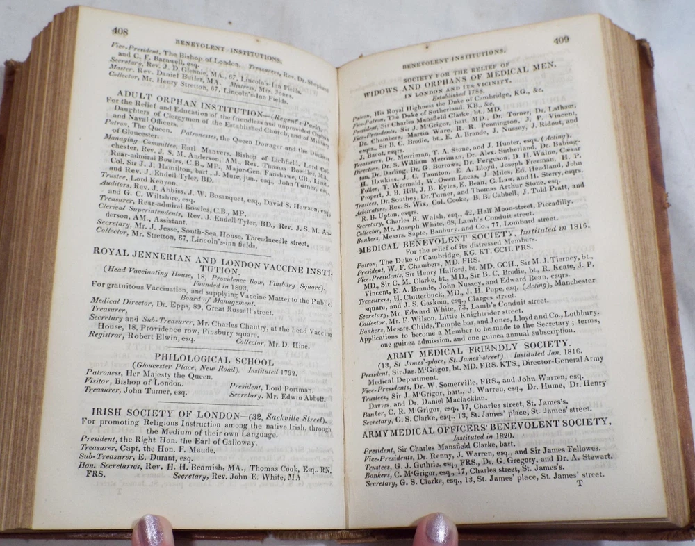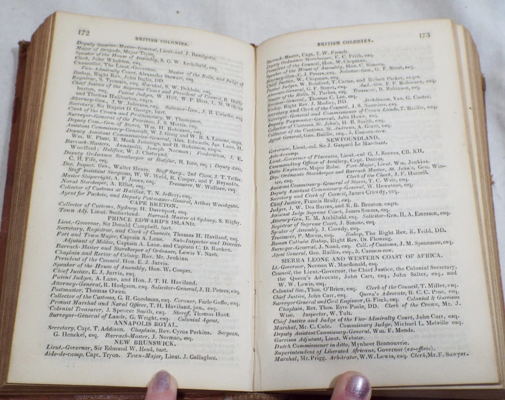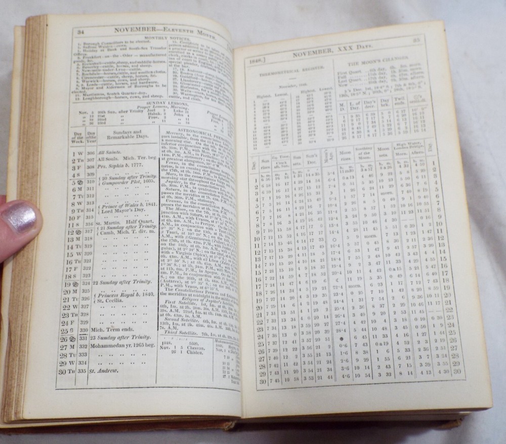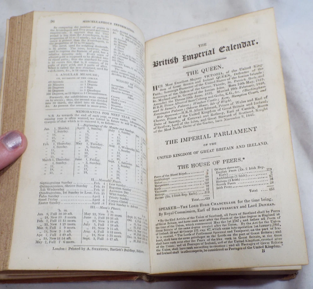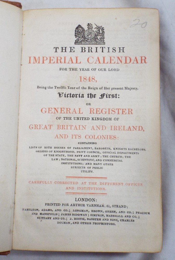 Title: EARLY Antique Book Description: Presented for your consideration is this EARLY and RARE antique book. The book is the British Imperial Calendar for the 1848 year under Victoria the first's rule. It is a general register of the UK, Great Britain and Ireland. It was printed for Arthur Varnham in London. The book lists a ton of information that includes names of military personnel, calendars, moon phases, board members of several different boards, and almanacs for each region. A ton of information is in this book! It is finished with a leather cover. Binding is in very good condition. Guaranteed to be old and original. This hard to find book would make a nice addition to any early book collection! Some general light to mild wear is on the cover. Little to no foxing. Overall in VERY GOOD-EXCELLENT condition for being over 150 years old! Measures 7 1/4" long, 4 1/2" wide and 1 1/2" thick. Please take a look at our photos and feel free to message us with any questions. Shipping Information: Please see shipping calculator below. Buy multiple items and save on shipping! -ATTENTION INTERNATIONAL BUYERS- Import duties, taxes and charges are not included in the item price or shipping charges. These charges are the buyer’s responsibility. Please check with your country’s customs office to determine what these additional costs will be prior to bidding/buying.” “These charges are normally collected by the delivering freight (shipping) company or when you pick the item up – do not confuse them for additional shipping charges.” “We do not mark merchandise values below value or mark items as ‘gifts’ - US and International government regulations prohibit such behavior.” Please see our auction list for a selection of other quality antiques currently up for sale. This item is being offered by: The Hitching Post Antiques Mall Established in "1984" - We welcome all bidders (and non-bidders, alike) to review a potential purchase or to visit and browse through our 8,000 square feet of antiques. We are located 2 miles west of beautiful Tecumseh, Michigan, on M-50 near the intersection of M-52. Voted Michigan's Lenawee County's "Finest Antique Mall", and presenting over 40 quality dealers under one roof, our staff will be happy to assist you in making an informed, knowledgeable purchase. Our store operates seven days a week, 361 days a year, during the hours of 10:00 a.m. to 5:30 p.m. Best Wishes! -- Your Friends at the Hitching Post Antiques Mall Please check out my other items ! And be sure to add me to your favorites list ! Please note that we try our hardest to assure accurate descriptions of the items we list. If you are unhappy with your purchase, please contact us so we can guarantee optimal satisfaction. Thank you and good luck!