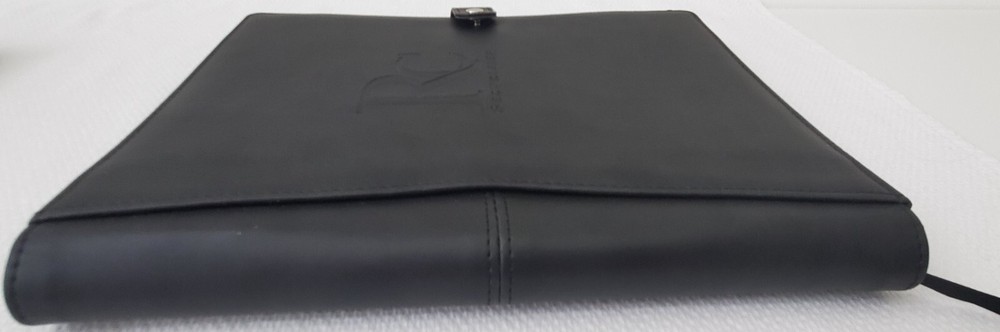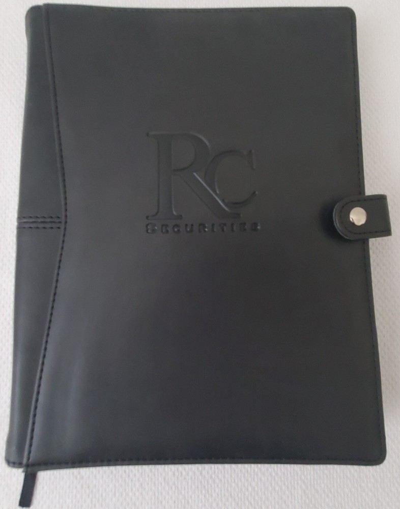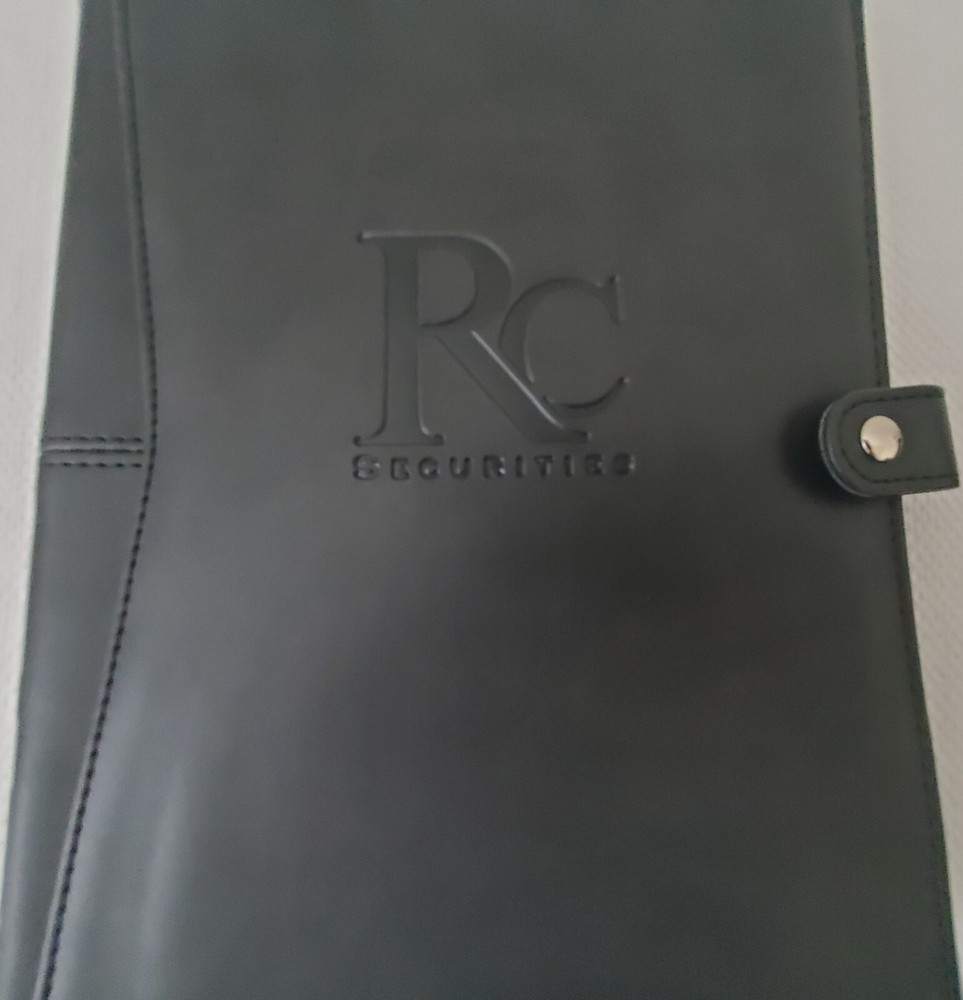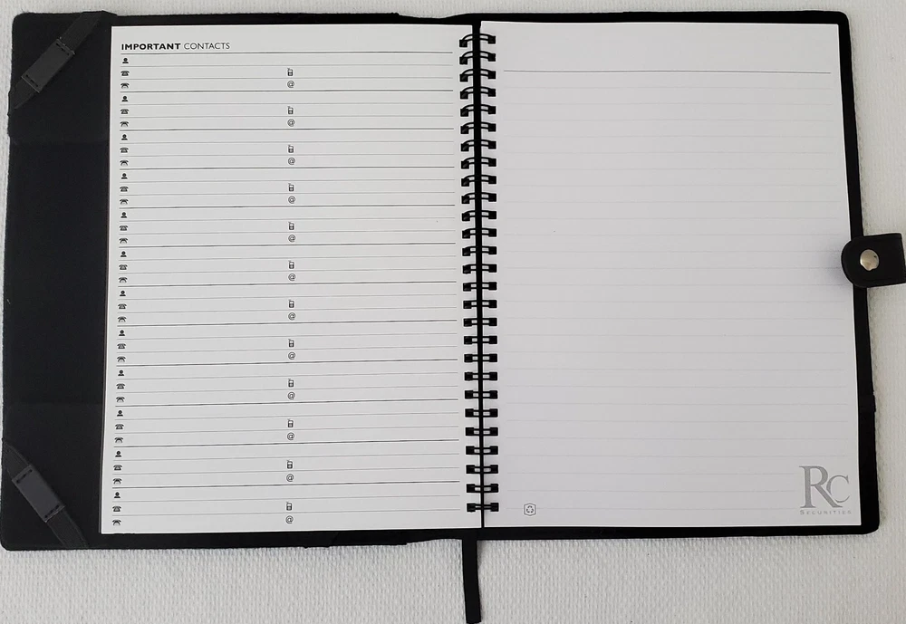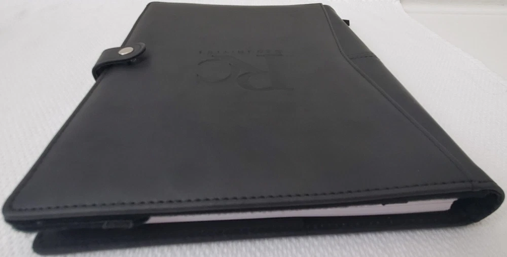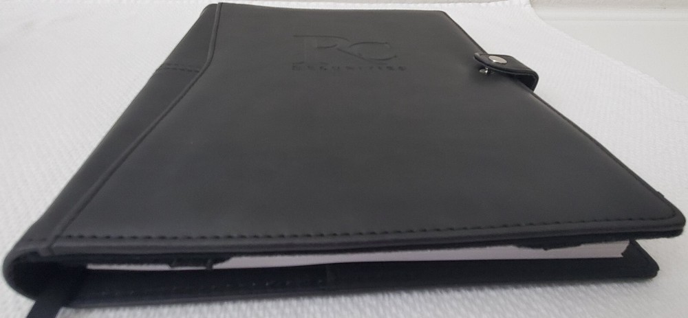 RC Securities - Black Folio with Lined Spiral Notepad, features front exterior slip pocket, interior bookmark ribbon, and back interior business card holder. Approximate measurements: Folio 10” x 8” and notepad 9.5" x 7". Item is in new and never used condition, from a smoke and pet free home. Shipped via USPS Ground Advantage.