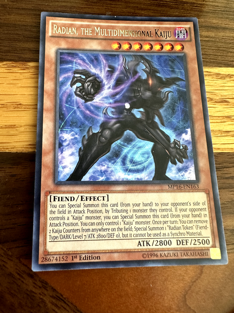 Hello! You are buying one Radian, the Multidimensional Kaiju MP16-EN163 1st Edition Rare in near-mint condition. As a thank you for buying from me, I will throw in two free Yugioh commons! Thank you so much for looking, have a great day! If there is ever an issue, please let me know so I can do whatever I can to resolve it! Please check out my other items! I have many more single cards!
