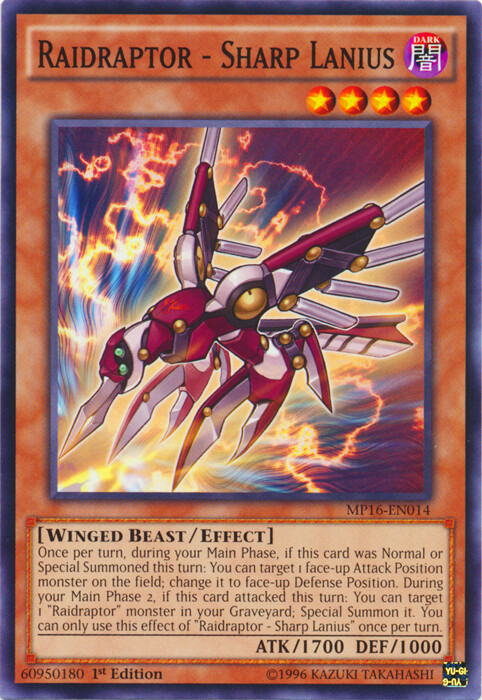 Please, carefully read the following: Image shown is a stock photo and does not reflect the actual card you will be receiving. Please refer to the condition guide below, the title and item description for what you will be receiving. Please also be aware that due to plastic shortages, orders may not always come in a plastic toploader but will always be protected as much as possible to prevent damage. You will receive 3x Raidraptor - Sharp Lanius - MP16-EN014 - Common - 1st Edition - Condition: Near Mint Please refer to the Title and Item Description above for the item being purchased. Delivery delays: Deliveries may not always fall within the estimated delivery dates when shipping outside of Canada and USA. Many factors may contribute to delays in delivering the package such as weather and customs. Please note that delivery to international locations may take up to 8 weeks to arrive . We always ship out orders within 1 business day and after dropping off with the post office, delivery times are out of our control. Feedback: We will always leave positive feedback for you and we ask if you can do the same for us. If there is any reason why the transaction was not up to your expectations, please message us before leaving feedback so we can address the issue. Combined shipping: To receive a combined shipping quote, please make sure that you commit to purchasing on ebay.ca . This allows us to send you a combined shipping invoice before payment. Shipping within the USA (6-10 Business days): FREE! Shipping within Canada (3-8 Business days): FREE! Shipping and handling delay: We aim to ship all orders within 1 business day. We do not ship on weekends and holidays. Condition Guide: We do not sell any cards that are in MINT condition, the best condition that we offer is near mint. Near Mint (NM) - Cards in Near Mint condition show minimal to no wear from shuffling, play or handling and can have a nearly unmarked surface, crisp corners and unblemished edges outside of a few minimal flaws. A Near Mint card may have a tiny edge nick or a tiny scratch or two, but overall look nearly unplayed with no major defects or flaws. Lightly Played (LP) - Cards in Lightly Played condition may have minor border or corner wear or even just slight scuffs or scratches. There are no major defects such as water damage, bends or issues with the structural integrity of the card. Noticeable imperfections are okay, but none should be too severe or at too high a volume. Moderately Played (MP) - Cards in Moderately Played condition exhibit condition issues visible at a casual glance. Cards in Moderately Played condition can have border wear, corner wear, scratching or scuffing, creases or whitening, minor dirt buildup or any combination of mild examples of these marks. A Moderately Played card may have some form of a more major marking, such as spot water damage or creasing that doesnʼt affect card integrity, but not in combination with other issues such as scratches, scuffs or border/edge wear and not impacting a large area of the card. Heavily Played (HP) - Cards in Heavily Played condition show a severe amount of wear. Heavily Played condition can include cards that have major creasing, major whitening, major border wear or any combination of those flaws. (These flaws cannot prevent the card from being tournament playable when sleeved.) Damaged - Cards in Damaged condition can exhibit a tear, bend or crease that may make the card illegal for tournament play, even in a sleeve. Cards in Damaged condition may have extreme border wear, extreme corner wear, heavy scratching or scuffing, folds, creases or tears or other damages that impacts the structural integrity of the card.
