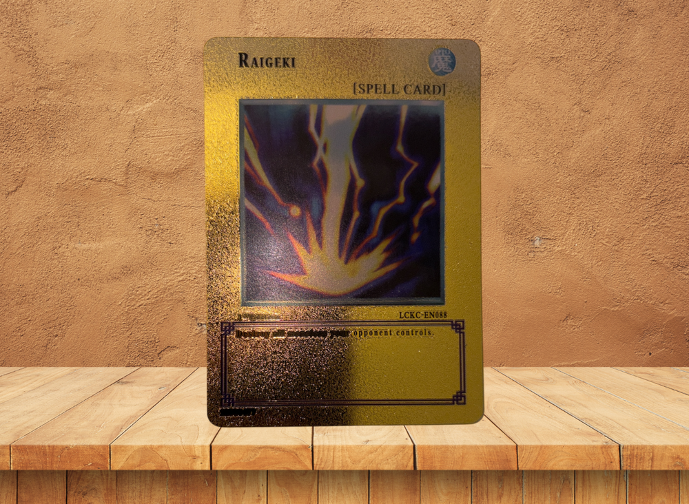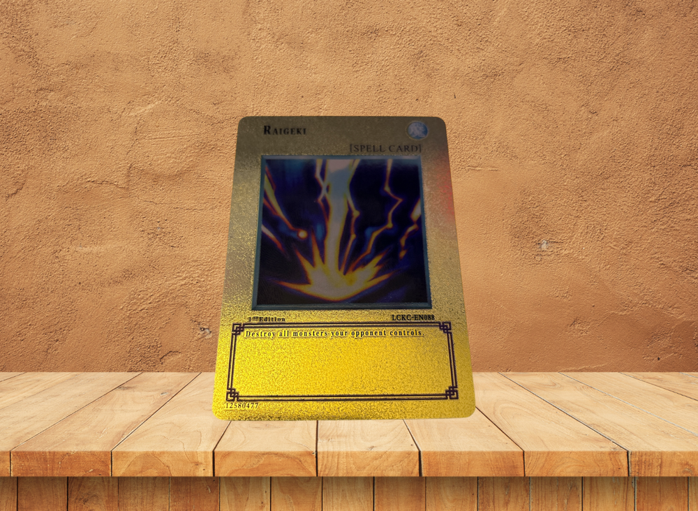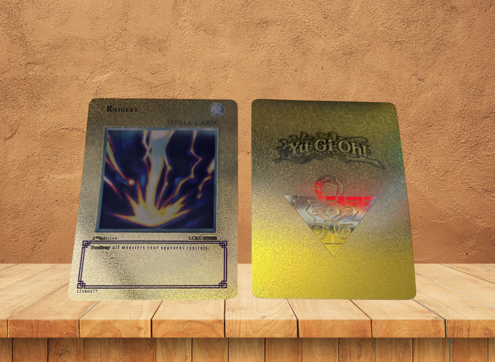 12Elevate your Yu-Gi-Oh! TCG collection with the striking Raigeki Gold Custom Promo card. A true gem for collectors and enthusiasts, this card is a standout piece from the Legendary Decks II series, showcasing the iconic blue eyes white dragon, red eyes black dragon, and dark magician girl in a dynamic full art design. With its limited edition status and the prestige of being a 1st edition release, this card is a must-have for anyone looking to make a statement with their deck or display. The card, numbered LCKC-EN088, features an eye-catching holo finish that brings the artwork to life, ensuring it shines in any collection. It's crafted in English and adheres to the standard card size, making it a perfect fit for your existing sets and protectors. Whether you're a seasoned player or a dedicated collector, this exclusive piece is a testament to the rich legacy of the Yu-Gi-Oh! TCG universe.