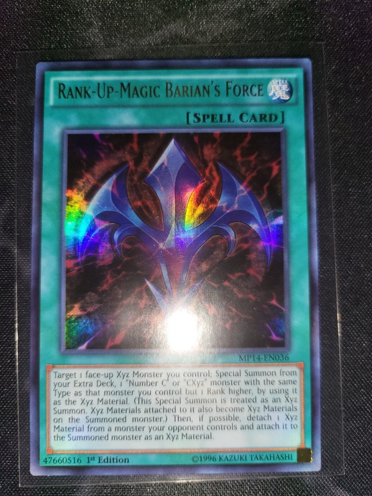 The Rank-Up-Magic Barian's Force card is an ultra rare spell card from the 2014 Mega-Tins Mega Pack 1st Edition set of the Yu-Gi-Oh! TCG. Manufactured by Konami, this English language card is numbered MP14-EN036 and belongs to the spell-normal card type. With a defense/toughness of 0 and an attack/power of 0, this card is a valuable addition to any Yu-Gi-Oh! card collection for fans of collectible card games and toys & hobbies.