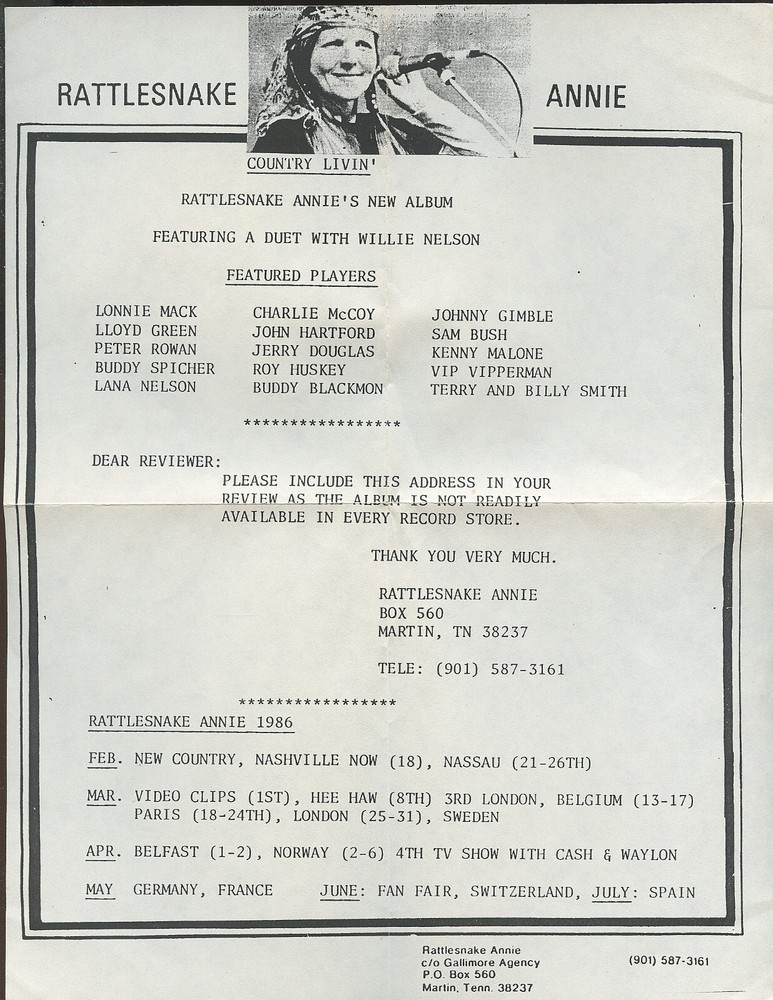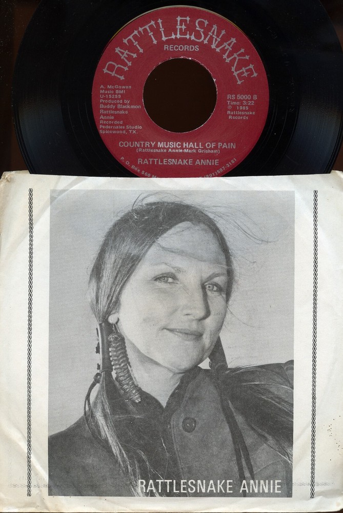 Rare Country 45rpm, Picture Sleeve and Insert by Rattlesnake Annie " Country Music Hall Of Pain " & " Funky Country Livin' " Rattlesnake Records # RS 5000 Record is in Mint Minus condition. Sleeve is in Very Strong VG+ condition . U.S. Postal Service Ground Advantage (previously known as First Class Mail) is the method of shipment to the U.S. and cost is calculated by mailing address. See shipping tab above. Will combine shipping on multiple purchases. Please read entire description before bidding or purchasing. All import duties or taxes are the responsibility of the buyer. Refer to your country's customs office if you have questions. NOTE: Items cannot be held after payment is made. All items must be shipped within one (1) day of payment.