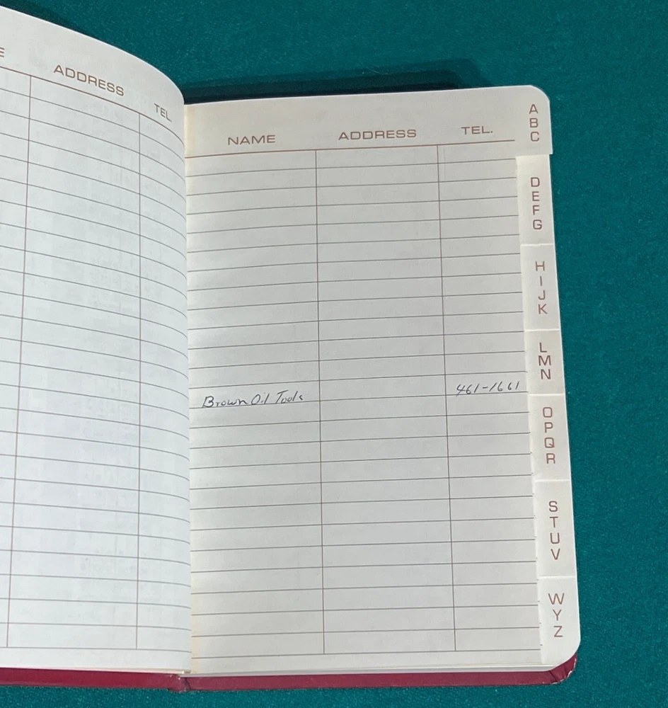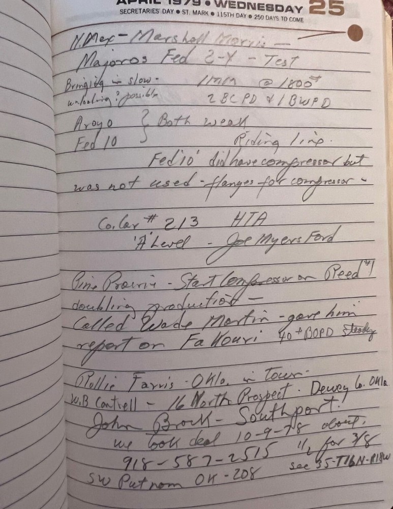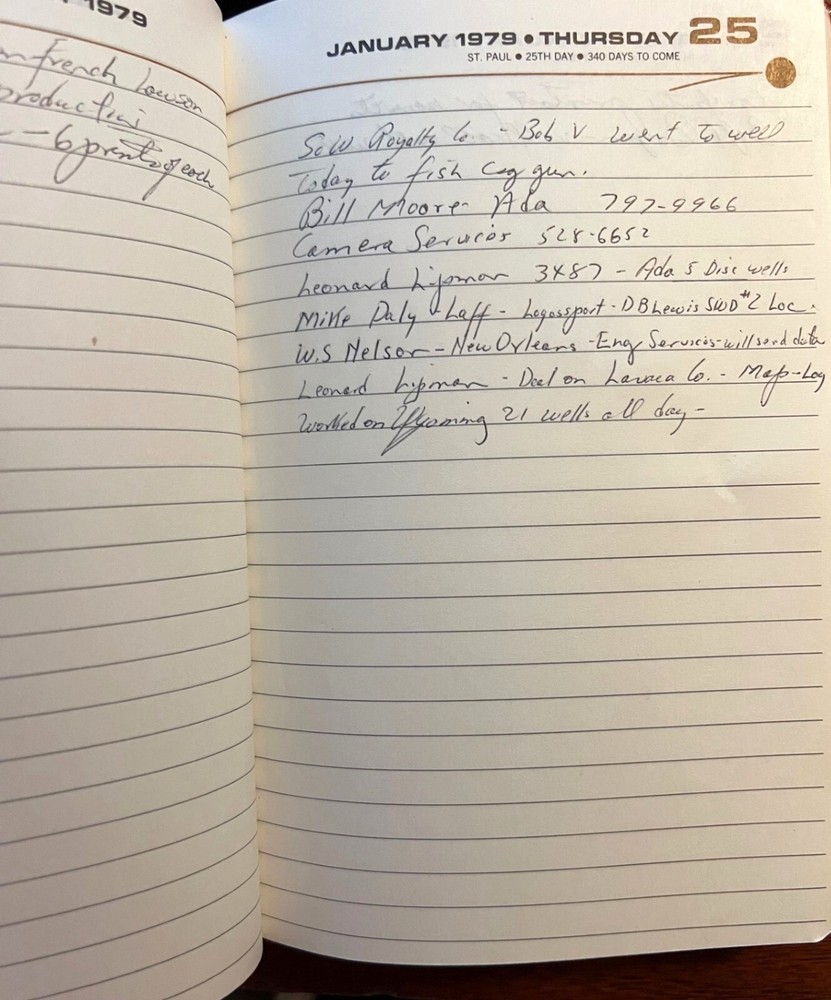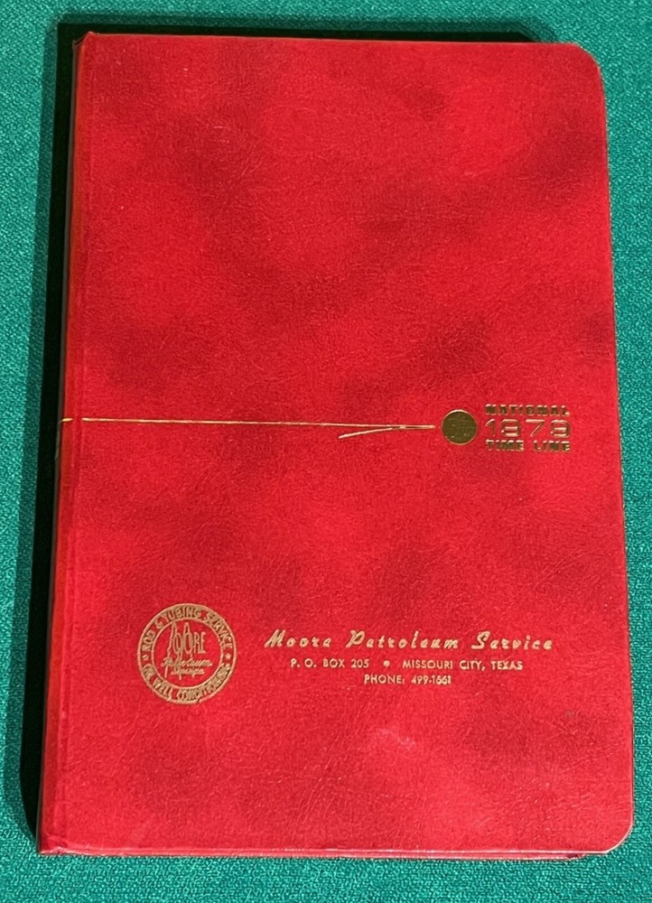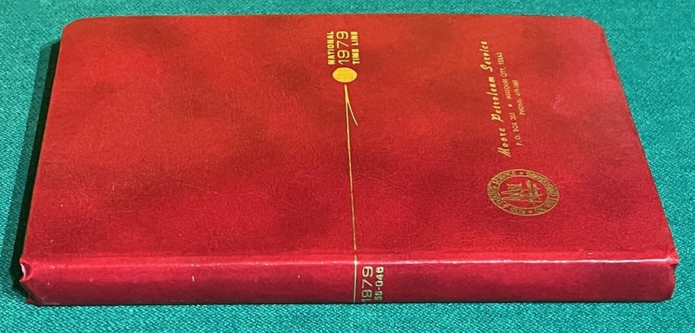 Rare Oil Field 1979 Leatherbound Moore Petroleum Services Planner w/ History. There is some writing in the book from 1978 referencing oil man John Brock and others in a few of the pages most of them are blank. Includes some reference to wells and production levels as well as business deals. Moore Petroleum Missouri City, TX is still in business today very unique piece of history. The leatherbound planner book has minimal wear from storage over the years but is in excellent condition.