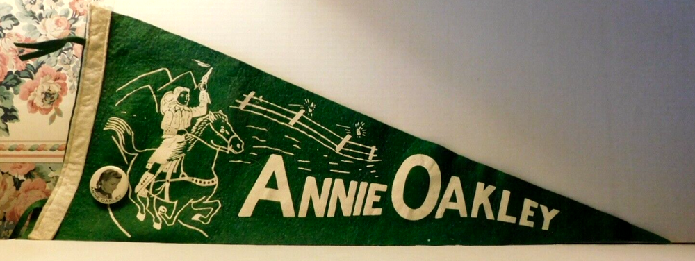 Rare TV Annie Oakley Pennant and Photo Pin back. 2" pin and 11 x 28" Pennant. Overall condition Fine with light handling. Super nice photo 2" pin back. Nice glossy front with age patina on rear. Ships to USA ONLY. No International Shipping. No returns on this item. Make sure the item is what you want before you bid / buy. Feel free to ask any questions. We Combine Shipping!