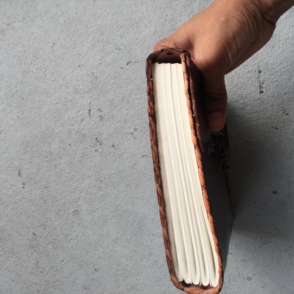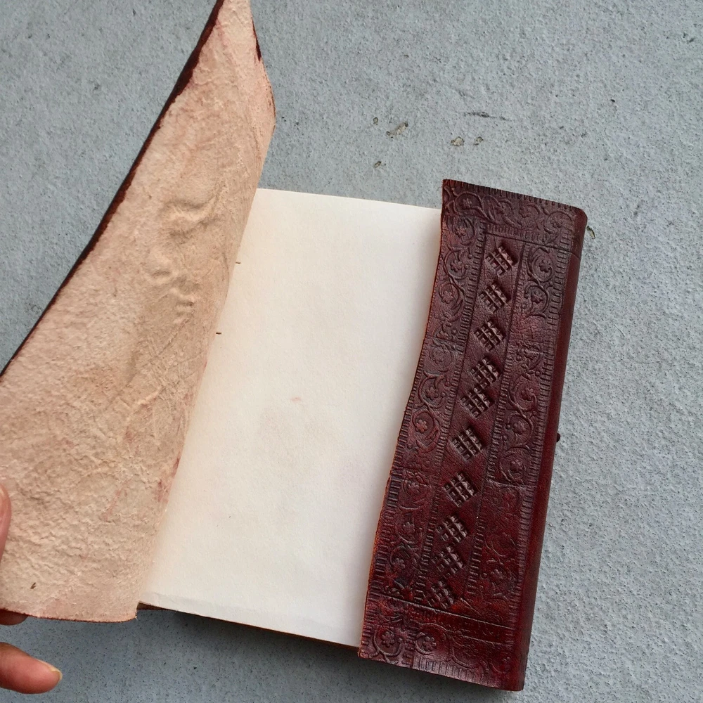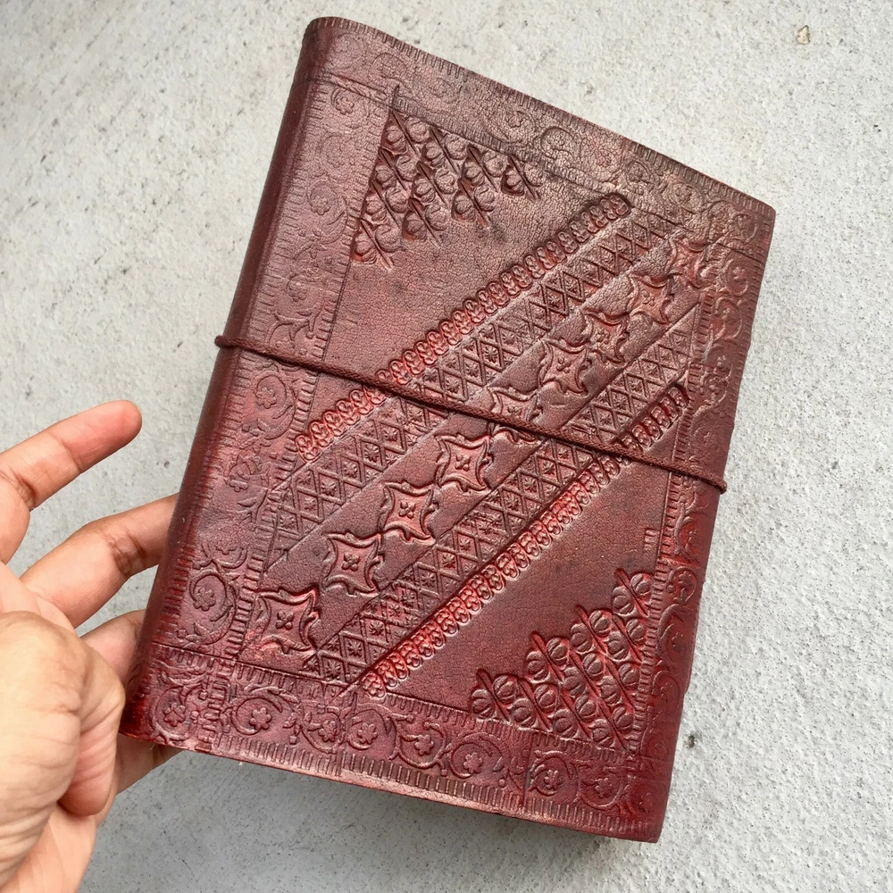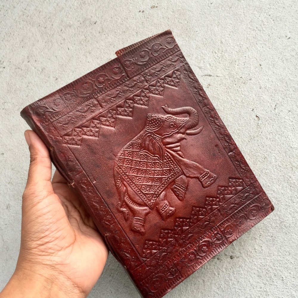These journals are hand made from leather and hand embossed. The paper is naturally treated cotton paper which are best suited for writing, noting, jotting, sketching, doodling etc. Product Dimensions: Length - 7 in * Width - 5 in - 200 pages approximately Leather used: Bull hide or goat leather Paper Used: SAVE TREES with us - we use eco friendly recycled cotton paper (recycled 100% cotton rag) Since these journals are fully handmade, there could be slight variations in the embossing or sewing or color in every batch *****A little about these journals:******** We were lucky to once find a collection of vintage journals from the 1990's which was handmade and we immediately fell in love with them. Hence we have started to make our own line of journals with our own designs and the latest trendy designs. Each journals is designed and prototyped by me and then the rest of the process is handled by a production partner with help of necessary hand tools Each Journals is fully hand made! We create embossing plates for the designs and those designs are hand embossed on the leather and then they are hand sewn into books. The paper used in these journals are also handmade with cotton. ( Save trees with us as the papers are 100% recycled and handmade) My clients usage: Gifts for him , valentines gift, anniversary or wedding or housewarming gifts, home decor, modern home decor and many more these are ready to ship items and will ship within 1-2 business days. If you are an international customer, then I suggest to upgrade to Priority mail so that you can get the tracking number to track the shipment. PLEASE NOTE: If you wish to purchase more than one item at the same time, please send me a message to request if I could do a combined shipping cost.