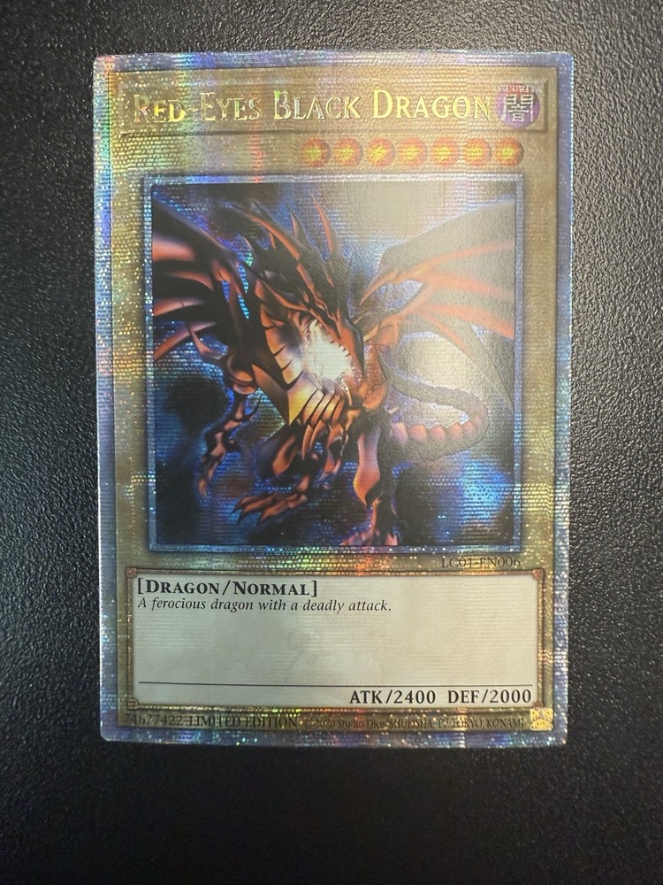 NM-Mint Sitting in binder since pulled Sleeve and toploader included The Red-Eyes Black Dragon (25th Anniversary Edition) LC01-EN006 Legendary card is a highly sought-after collectible card game item from the Yu-Gi-Oh! TCG. This ultra rare card features a dark dragon creature type with impressive defense and attack stats of 2000 and 2400 respectively. Manufactured by Konami, this limited edition card is part of the Legendary Collection and is sure to be a prized addition to any collector's deck. With its English language and unique card number, this special edition Red-Eyes Black Dragon card is a must-have for fans of the game.