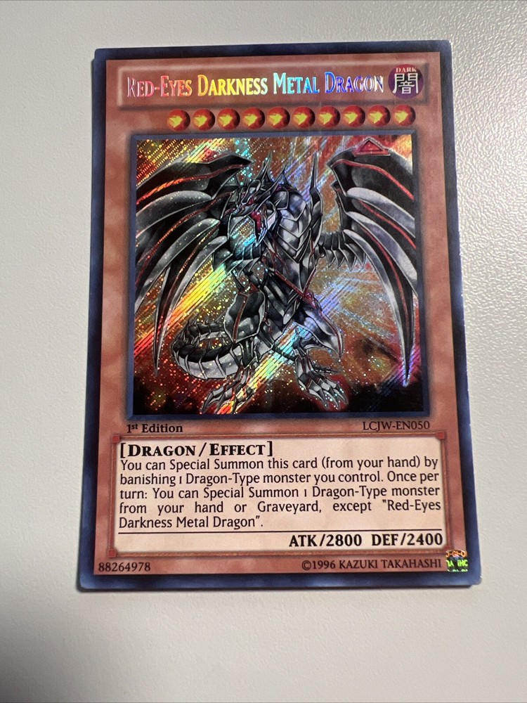 The "Red-Eyes Darkness Metal Dragon" is a Secret Rare card from the Yu-Gi-Oh! TCG Legendary Collection 4: Joey's World set. This Dragon-type creature has an impressive Attack/Power of 2800 and a high Defense/Toughness of 2400, making it a formidable card in gameplay. It is an Effect card with the Attribute of Dark and is part of the 1st Edition release, adding to its rarity and collectibility. Manufactured by Konami, this English-language card is a sought-after addition to any Yu-Gi-Oh! TCG collection.