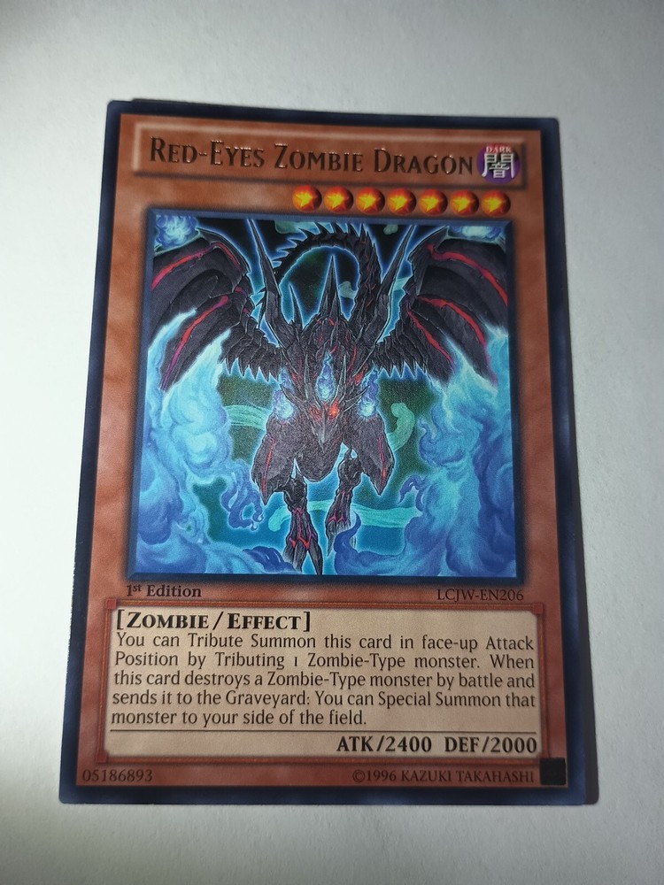 This rare and powerful card from the Yu-Gi-Oh! TCG Legendary Collection 4: Joey's World set is a must-have for any collector or player. The Red-Eyes Zombie Dragon card, with card number LCJW-EN206, boasts an attack power of 2400 and a defense toughness of 2000. This 1st edition card is in English and manufactured by Konami. It is perfect for those who want to enhance their gameplay or expand their collection. Get your hands on this rare and powerful Red-Eyes Zombie Dragon card today!