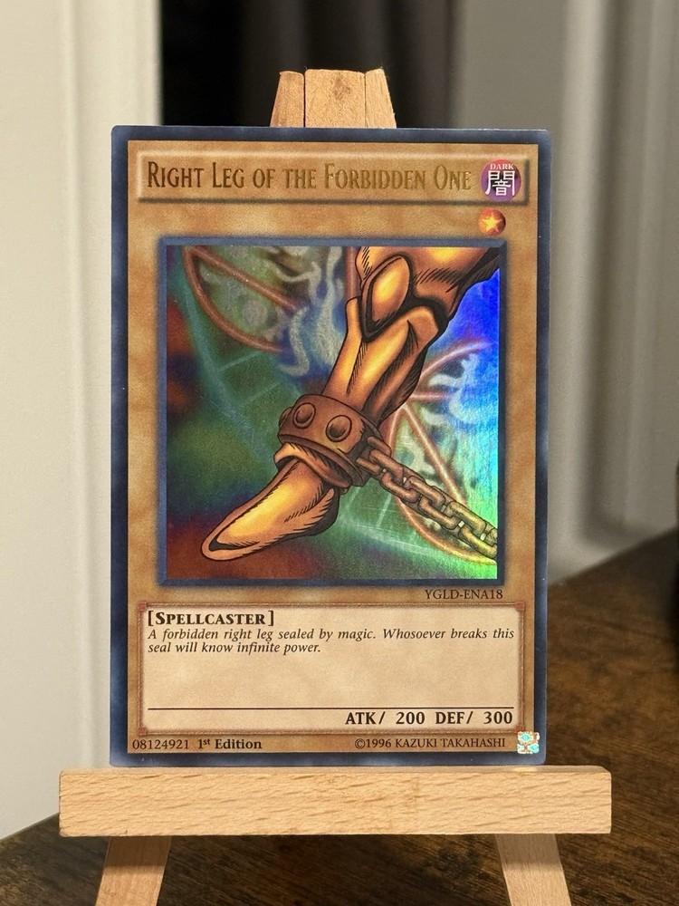 The Right Leg of the Forbidden One YGLD-ENA18 Ultra Rare Unlimited LP is a powerful and collectible card from the Yu-Gi-Oh! TCG set King of Games: Yugi's Legendary Decks-Unlimited Edition. This Dark Spellcaster card has a high Defense/Toughness of 300 and an Attack/Power of 200, making it a valuable addition to any player's deck. Manufactured by Konami, this English-language card is a sought-after item for collectors and players alike.